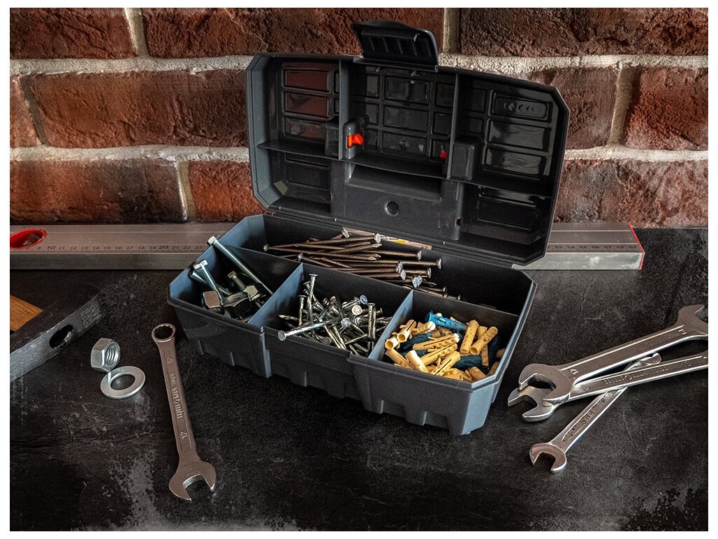 **Органайзер для крепежа Blocker ** подойдет для эксплуатации в быту, гараже или мастерской. Может использоваться для размещения принадлежностей для шитья, рыболовства, рукоделия. Позволяет компактно хранить и транспортировать метизы, мелкий инструмент. Внутри располагаются четыре отсека. Складная ручка упрощает переноску бокса с одного места на другое. Крышка закрывается на защелку, не позволяет изделиям рассыпаться при переворачивании.