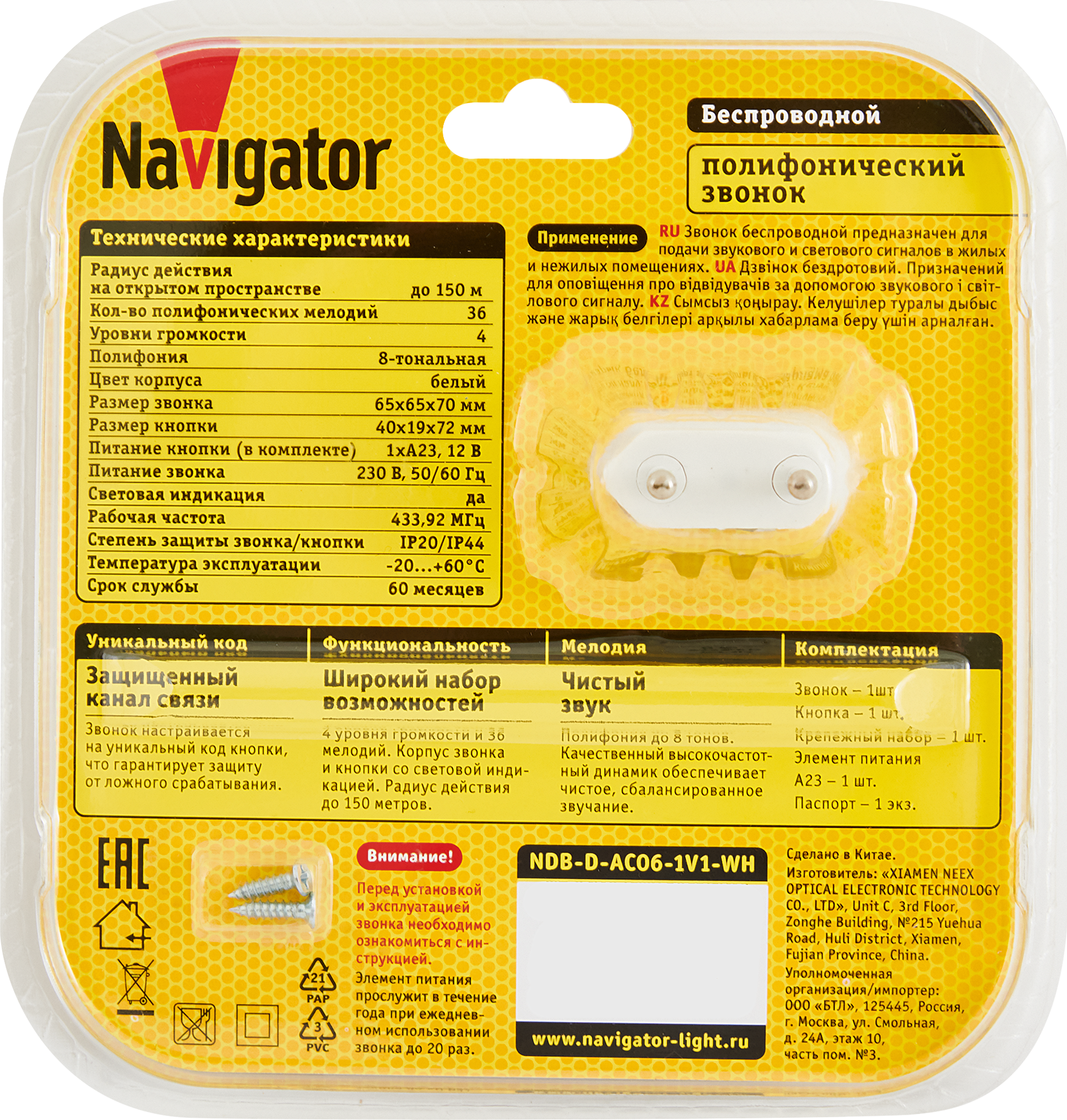 Дверной звонок беспроводной Navigator 80 509 36 мелодий цвет белый NDB-D-AC06-WT
