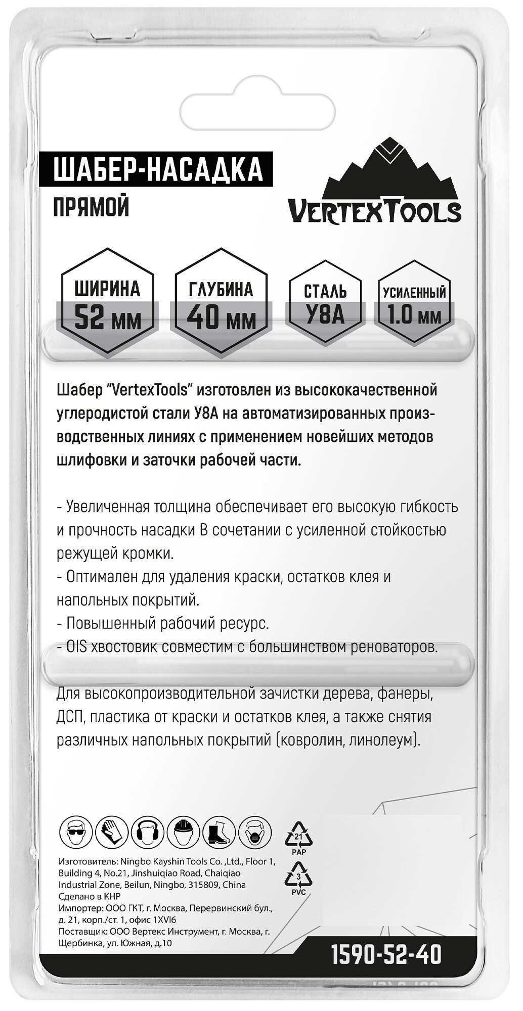 **Насадка-шабер прямая Vertextools** — деталь, используемая для оснащения реноваторов. Хвостовик OIS обеспечивает простоту установки и демонтажа. Подходит для удаления лакокрасочных составов, остатков клея и силикона, снятия напольных покрытий — ковролина или линолеума, фанеры и ДСП. Используется для зачистки деревянных и пластиковых поверхностей.