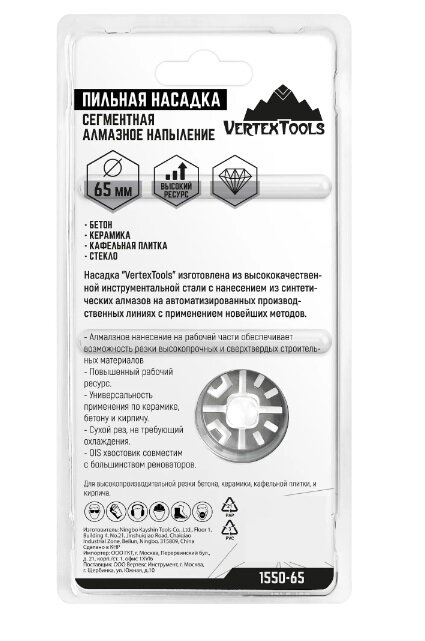 Насадка пильная сегментная по керамике Vertextools 65 мм Пильная насадка алмазная 65мм