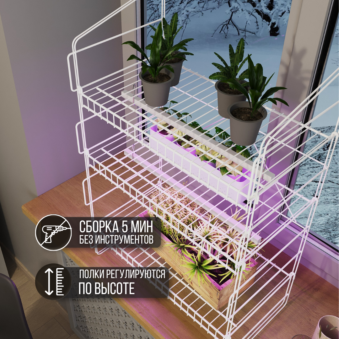 - Эстетика. Стеллаж для рассады «Найди» в белом цвете выглядит аккуратно, легко и не выделяется на фоне комнаты.