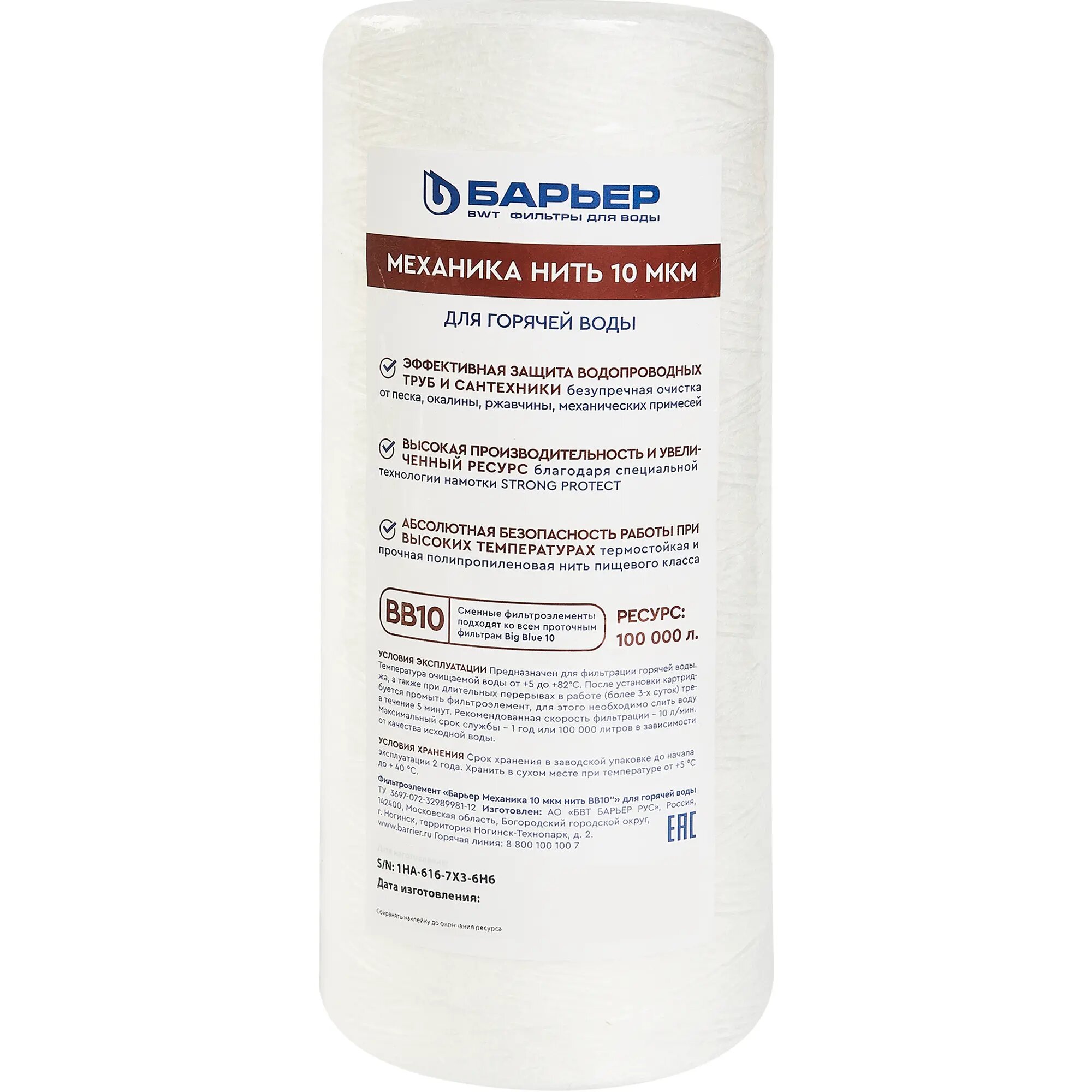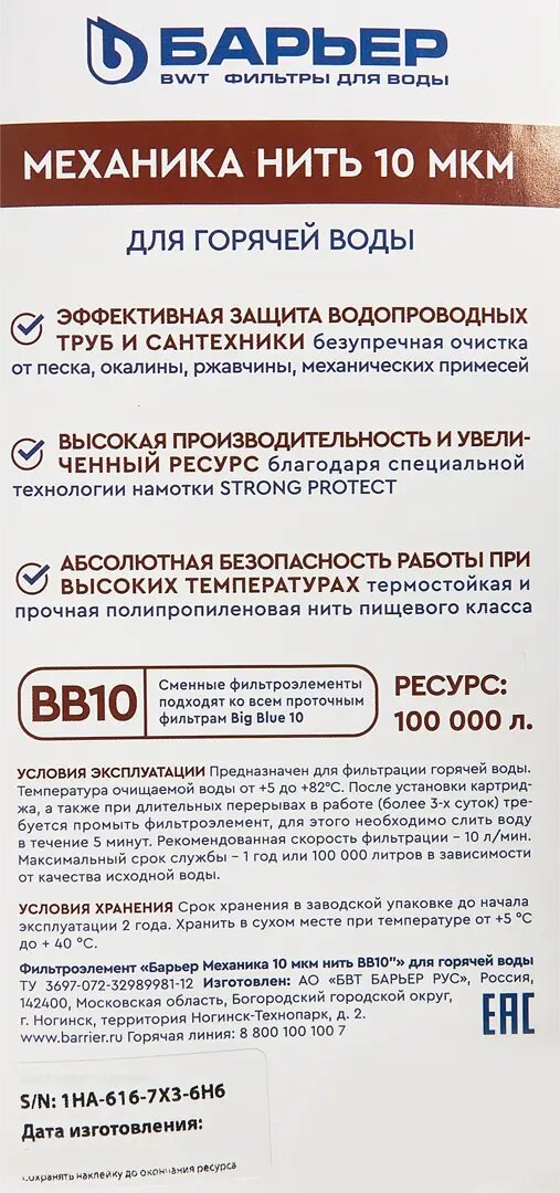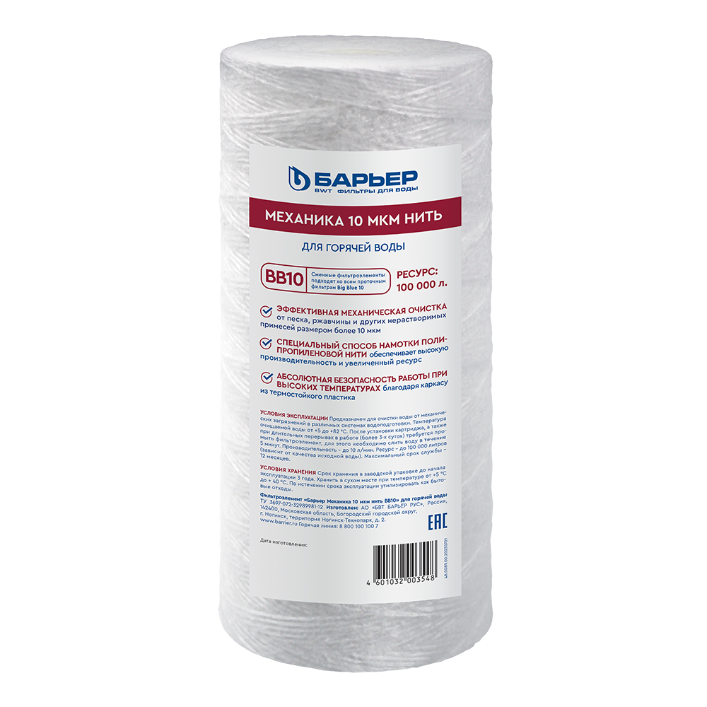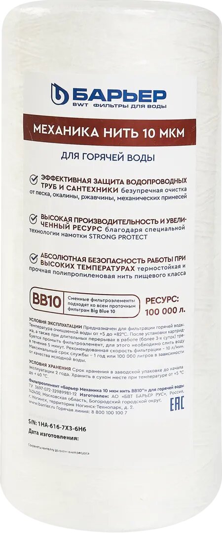 **Картридж механической очистки Барьер BB10 нить 10 мкм для горячей воды** эффективно задерживает песок, ржавчину и другие механические примеси до 10 мкм, обеспечивая надежную защиту водопроводных труб и сантехники.