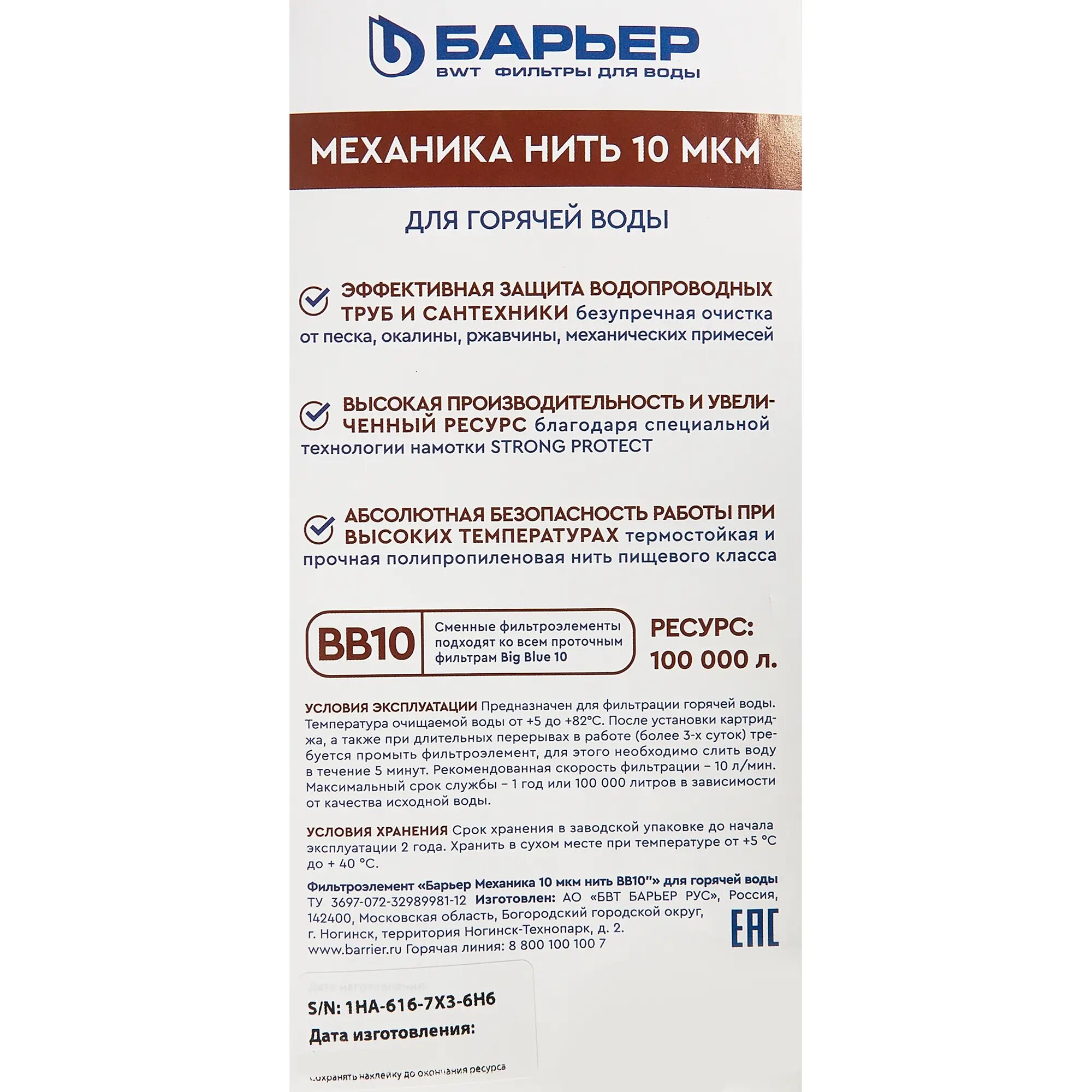 При производстве картриджа используется термостойкая полипропиленовая нить пищевого класса, благодаря чему достигается абсолютная безопасность работы при высоких температурах до +82 °С.