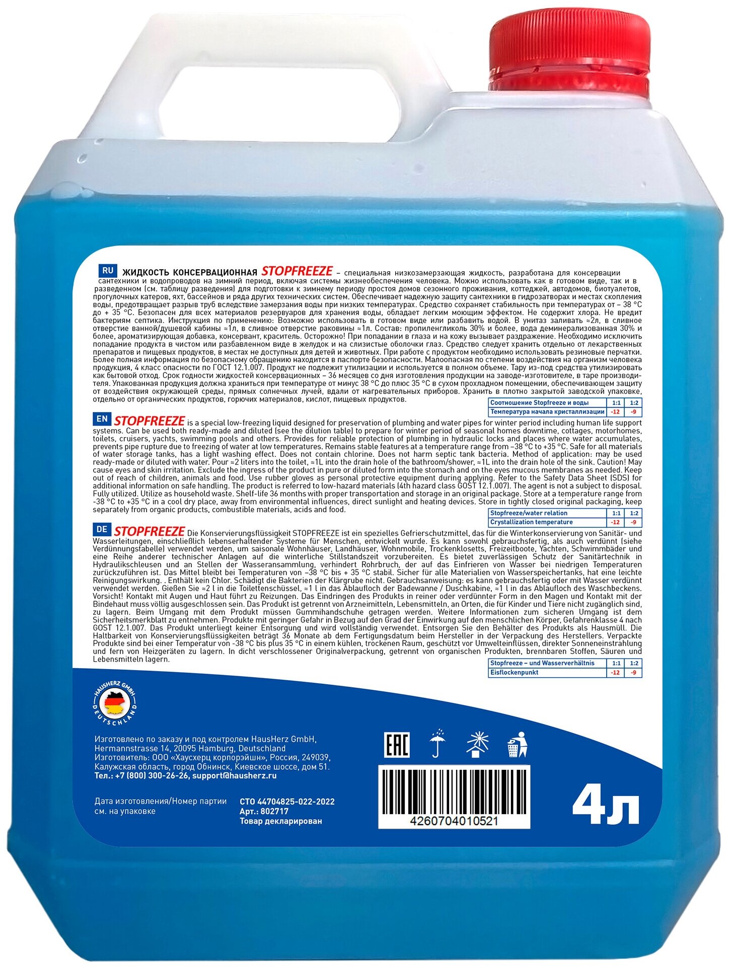 **Консервант для сантехники Stopfreeze** обеспечивает надежную защиту оборудования в гидрозатворах и местах скопления воды. Предотвращает разрыв труб при замерзании воды при низких температурах. Используется в зимний период в системах водоснабжения, в том числе предназначенных для жизнеобеспечения человека.