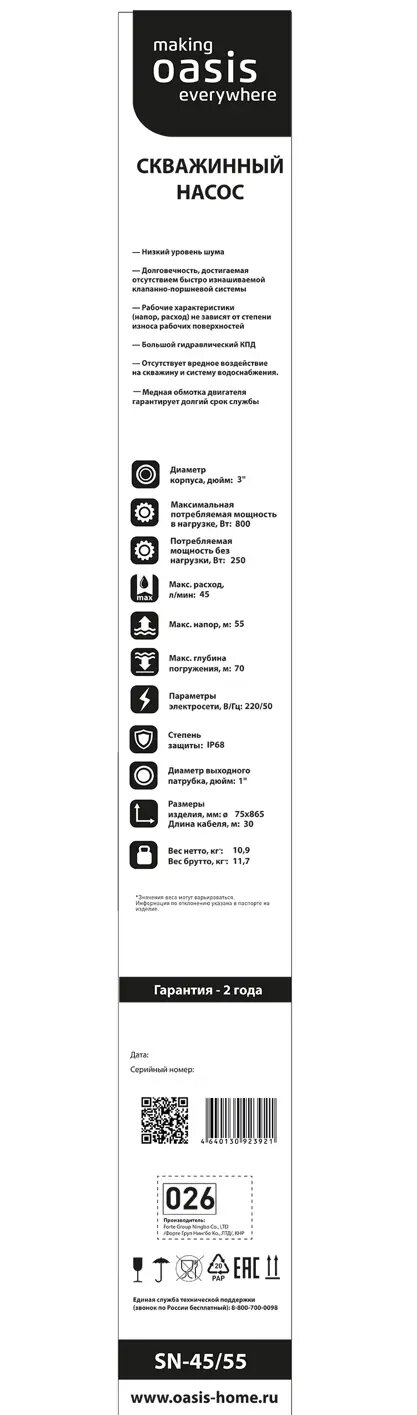 Насос садовый скважинный Oasis кабель 30 м 2700 л/час SN-45/55