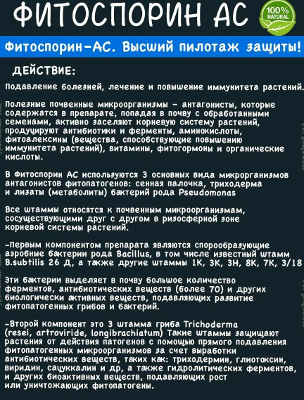 **Фитоспорин-АС биофунгицид** — средство, предназначенное для обработки растений. Защищает их от грибков и бактерий, образования гнили, увядания. Повышает иммунитет культур, снижает негативное влияние стресса при пересадке, изменении погодных условий.