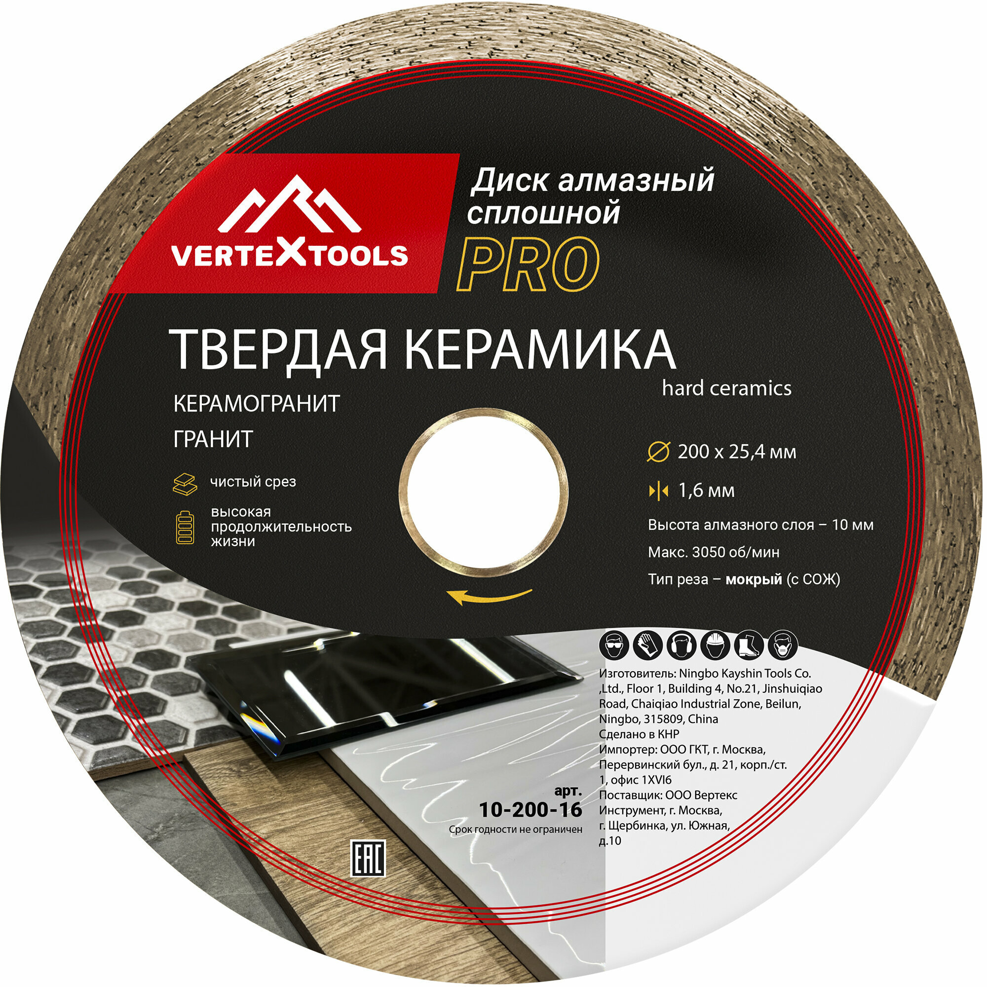 Диск алмазный по керамике Vertextools 200x25.4x1.6 мм 10-200-16