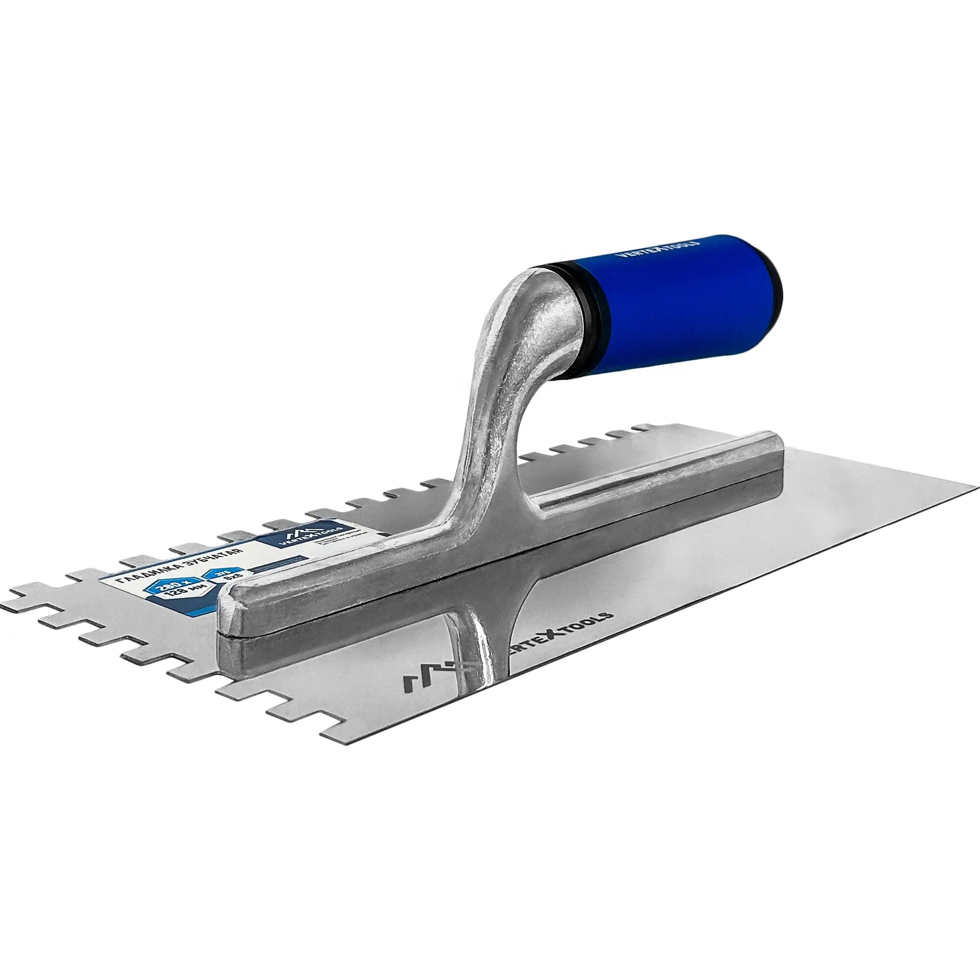 **Гладилка Vertextools ** имеет зубчатые края. Предназначена для отделочных и ремонтных работ, используется для нанесения строительных растворов или бетона ровным слоем. Конструктивно состоит из подошвы, изготовленной из нержавеющей стали, и рукояти. При помощи инструмента можно быстро и легко исправлять дефекты поверхности, заделывать трещины и неровности.