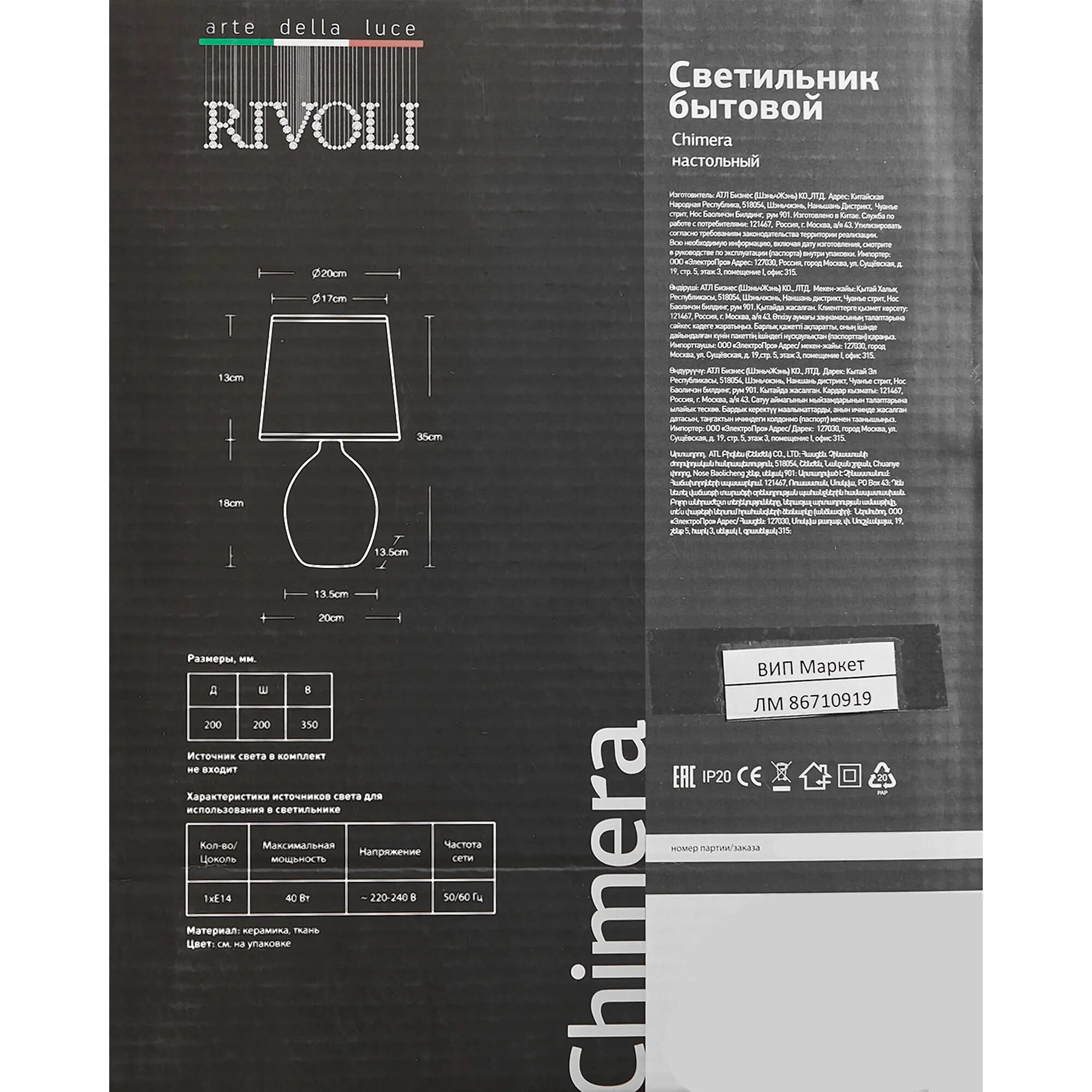 | Тип продукта | Настольная лампа (под лампу) |