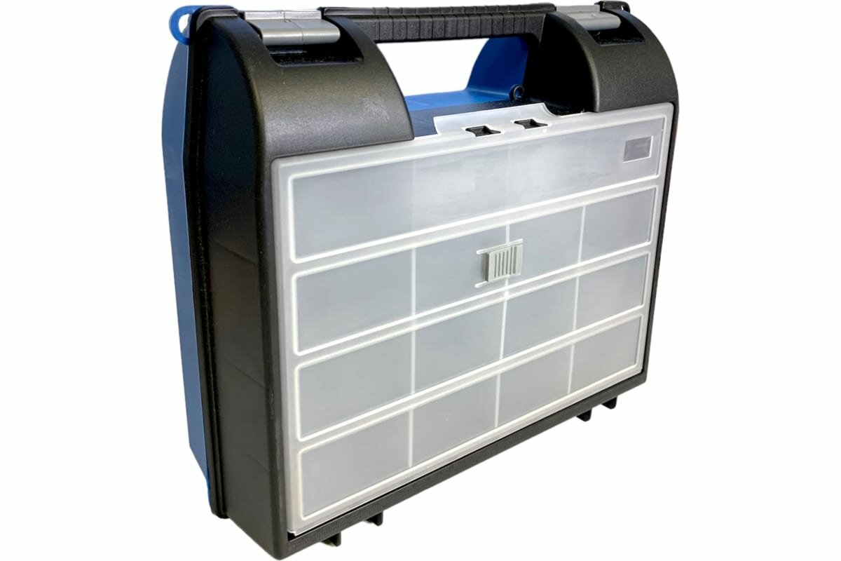 **Ящик для дрели** с органайзером используется для компактного хранения и удобства транспортировки устройства. Может применяться для размещения ручных инструментов, измерительных приборов или метизов. Крышка плотно фиксируется с помощью клипс. В верхней части расположена ручка для переноски.