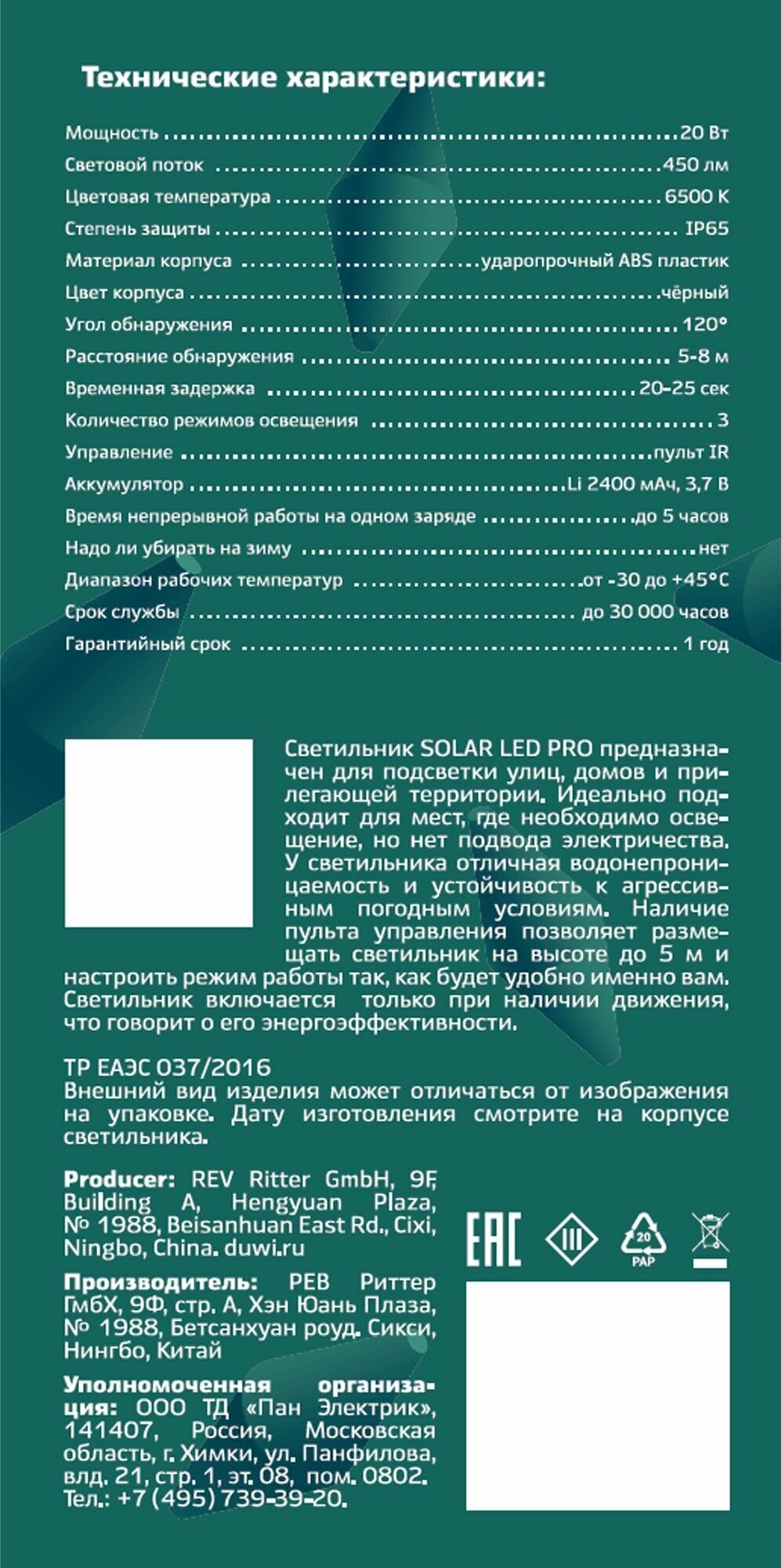 **Уличный настенный светильник duwi Solar Pro** предназначен для подсветки зданий и сооружений в ночное время. Включение фонаря происходит автоматически в тёмное время суток при движении в зоне действия датчика. Светодиодный светильник работает на солнечной батарее. Получаемого в течение светового дня заряда хватает на 5 часов непрерывной работы.