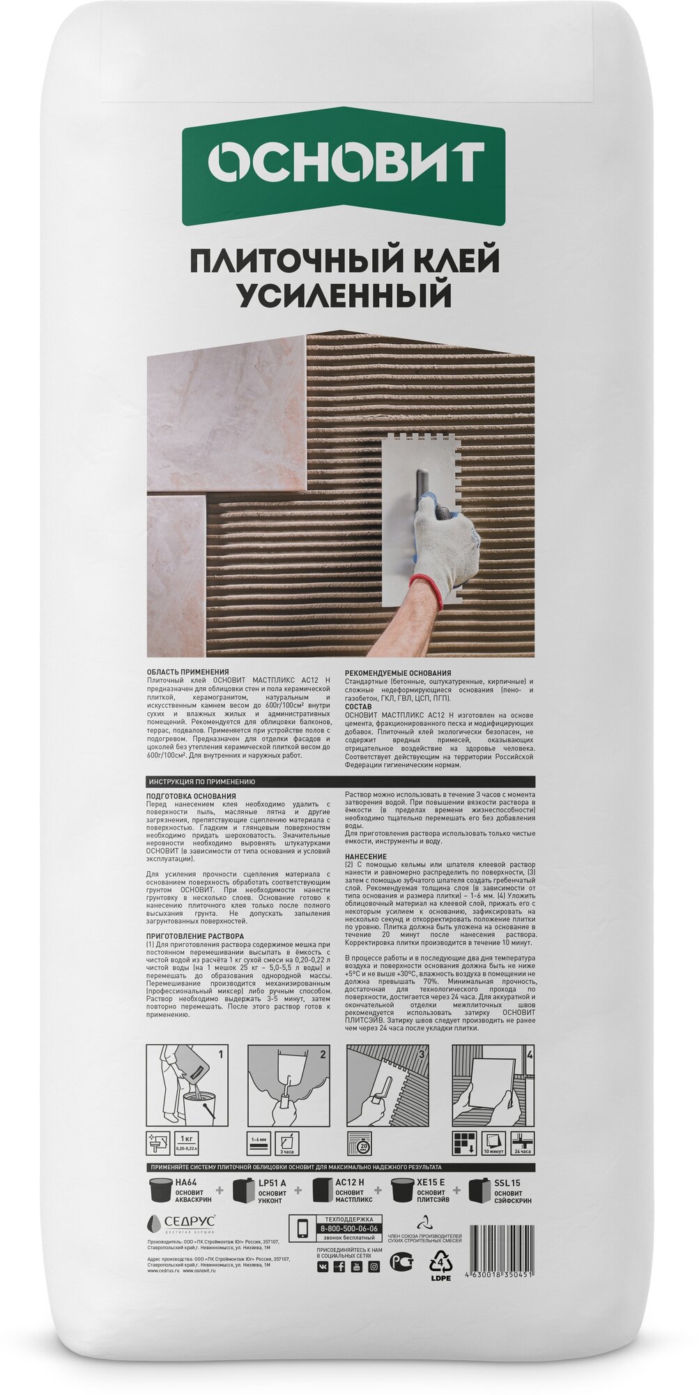 **Клей для плитки Основит С1T AC12 H** предназначен для проведения внутренних и внешних отделочных работ - террас, балконов. Подходит для обработки бетонных, покрытой штукатуркой, кирпичных и недеформирующихся оснований. Совместим с керамогранитом, плиткой, натуральным и искусственным камнем. Может использоваться при обустройстве полов с подогревом. При нанесении температура должна находиться в диапазоне от 5°C до 30°C, при эксплуатации - от -40°C до 70°C. В составе цемент, песок, добавки.