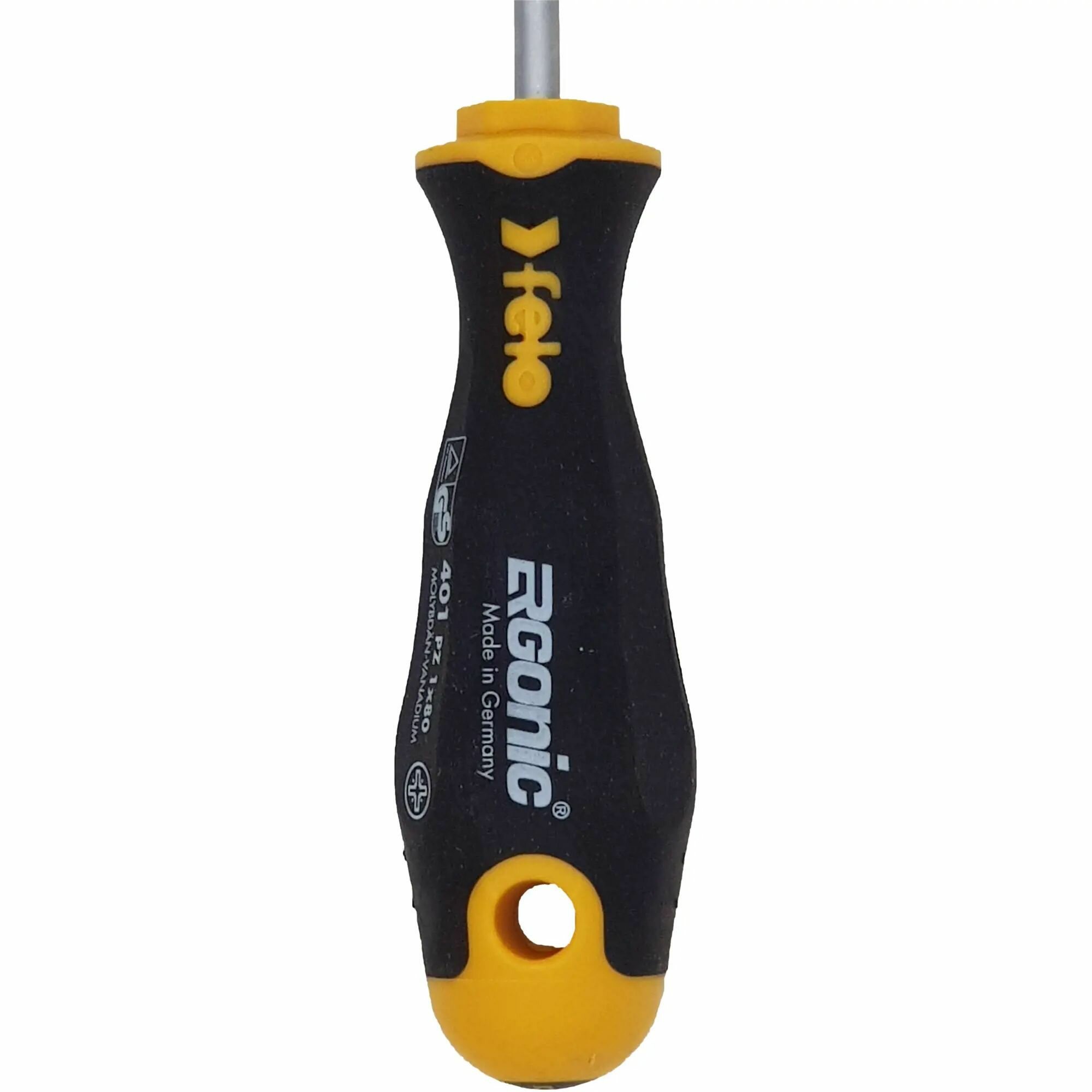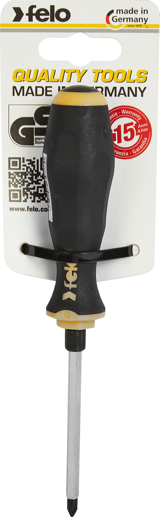 **Отвертка крестовая ударная Felo** предназначена для установки и демонтажа крепежных элементов типа PZ1. Наконечник черного цвета обеспечивает точность посадки. На основании стержня располагается шестигранная гайка, передающая большее усилие на метиз. Рукоятка изготовлена из двухкомпонентного пластика, что не позволяет ей скользить в ладони и гарантирует надежный хват. Бесшовное покрытие исключает трение о кожу или перчатку.