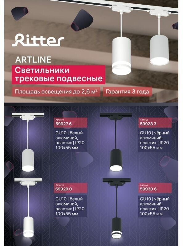 Трековый светильник Ritter ARTLINE предназначен для основного, акцентного и дополнительного освещения жилых комнат, офисов, торговых помещений, кафе, ресторанов. Один светильник рассчитан на площадь освещения до 2,6 кв.м. Для основного освещения требуется несколько светильников, установленных по периметру комнаты. Для создания интересного дизайнерского освещения рекомендуем комбинировать в одной комнате светильники разного типа, цвета и формы – поворотные, подвесные, белые, чёрные, золотые, серебряные, общего и акцентного освещения.Трековый светильник устанавливается на однофазный шинопровод с напряжением 220 В. Все трековые светильники и споты данной серии имеют универсальные размеры оснований и креплений, поэтому вы можете установить светильник и на уже существующий шинопровод. Все споты Ritter ARTLINE снабжены удобными рычажковыми коннекторами-контактерами, которые позволяют в любой момент устанавливать и снимать светильники. Две точки крепления делают светильник универсальным и безопасным. Для работы светильника необходимо установить светодиодную лампочку с цоколем GU10 максимальной мощностью до 40 Вт. Выбирайте подходящую яркость и цветовую температуру свечения лампы для создания необходимых световых акцентов на мебели, стенах, декоративных элементах и предметах быта. Трековые системы - самый актуальный и долгосрочный тренд дизайнерского освещения. Они стали непременным атрибутом современных проектов благодаря разнообразию сценариев освещения, мобильности и универсальности. Трековые светильники органично вписываются в любой стиль и комбинируются как с современными потолочными светильниками, светодиодными люстрами, настенными бра, так и с классическими моделями люстр.Трековая система освещения отлично подходит для помещений с большой площадью, со сложной формой, с высокими или многоуровневыми потолками, лестницами. Треки можно перемещать по шине, поворачивать в нужном вам направлении, создавая акценты или рассеянный свет, можно добавлять или убирать споты, подвесные светильники. У наших спотов понятная инструкция, по которой вы можете самостоятельно собрать трековую систему.Трековый светильник применяется, как правило, для освещения спальни, столовой, кухни, гостиной, коридора, зала, прихожей, детской игровой комнаты, кабинета, лоджии, гардеробной, квартиры, загородного дома, компактного офиса.