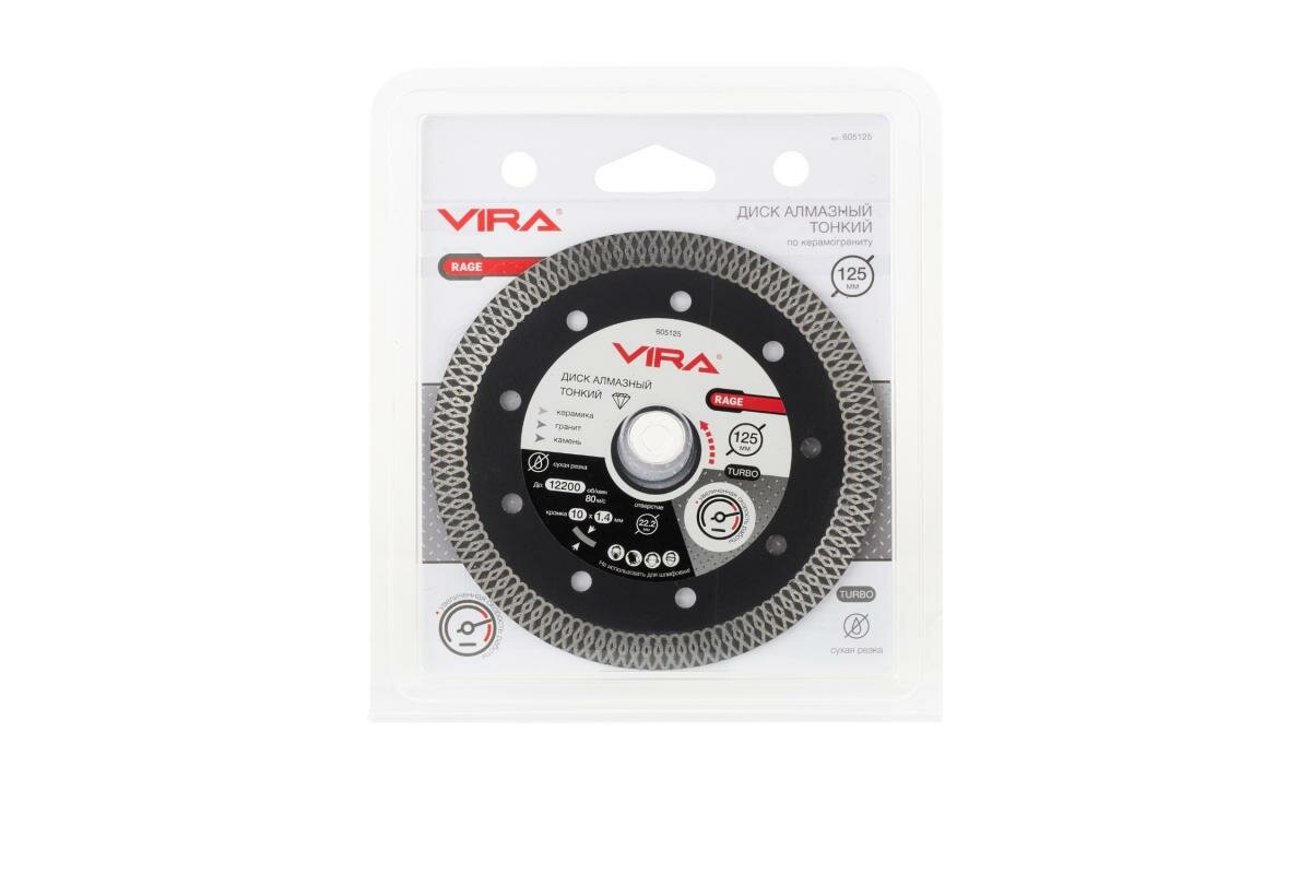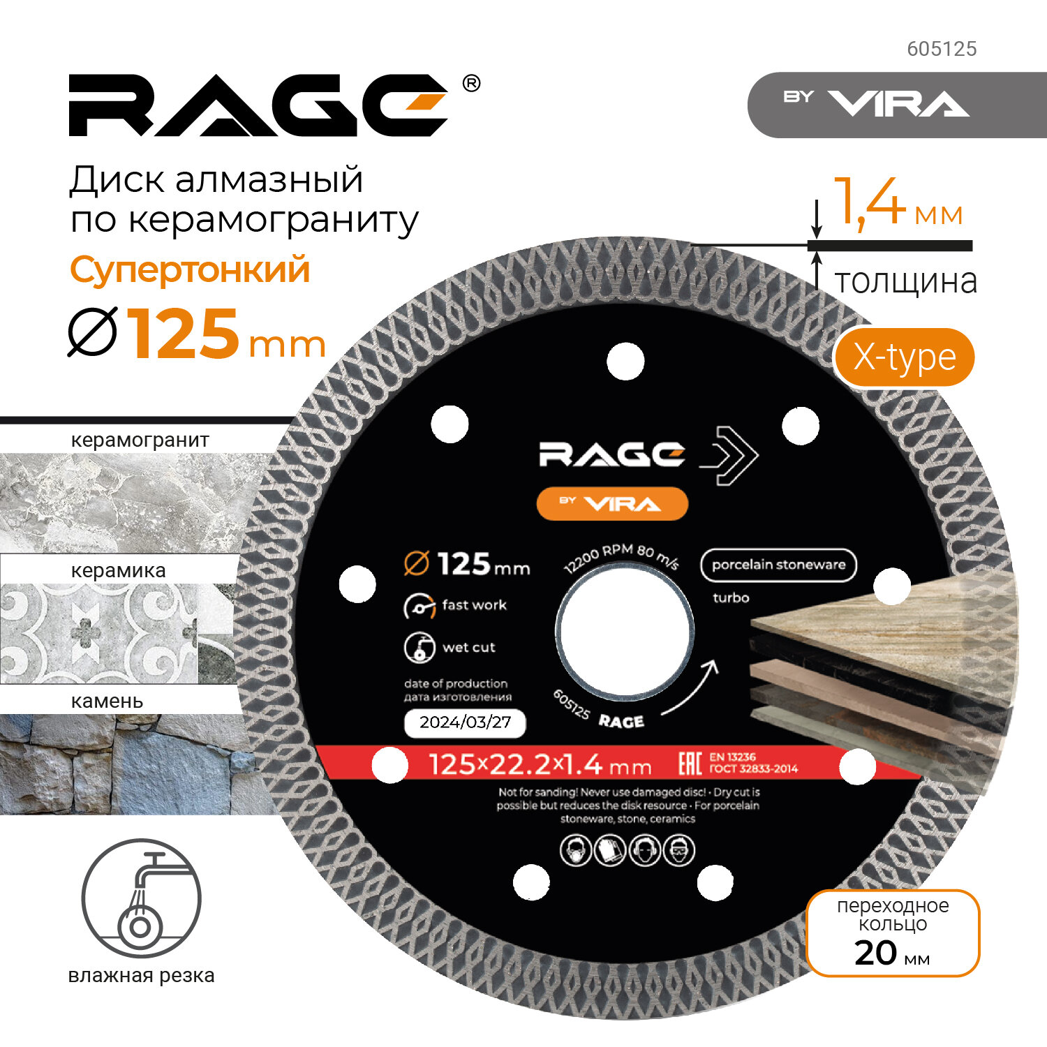 Диск алмазный тонкий по керамограниту RAGE VIRA 605 предназначен для угловых шлифмашин (болгарок). Применяется для резки керамического гранита, твердой и мягкой керамической плитки, а также плит из искусственного и натурального твердого камня. Благодаря возможности использовать воду для охлаждения во время работы уменьшается пылеобразование и увеличивается ресурс диска. Диск имеет высокую концентрацию алмазов мелкой фракции, а также небольшую толщину в 1.4 мм, что обеспечивает высокую скорость реза и повышенную чистоту кромок. Рекомендуются для профессионального применения при наличии большого объема работ.