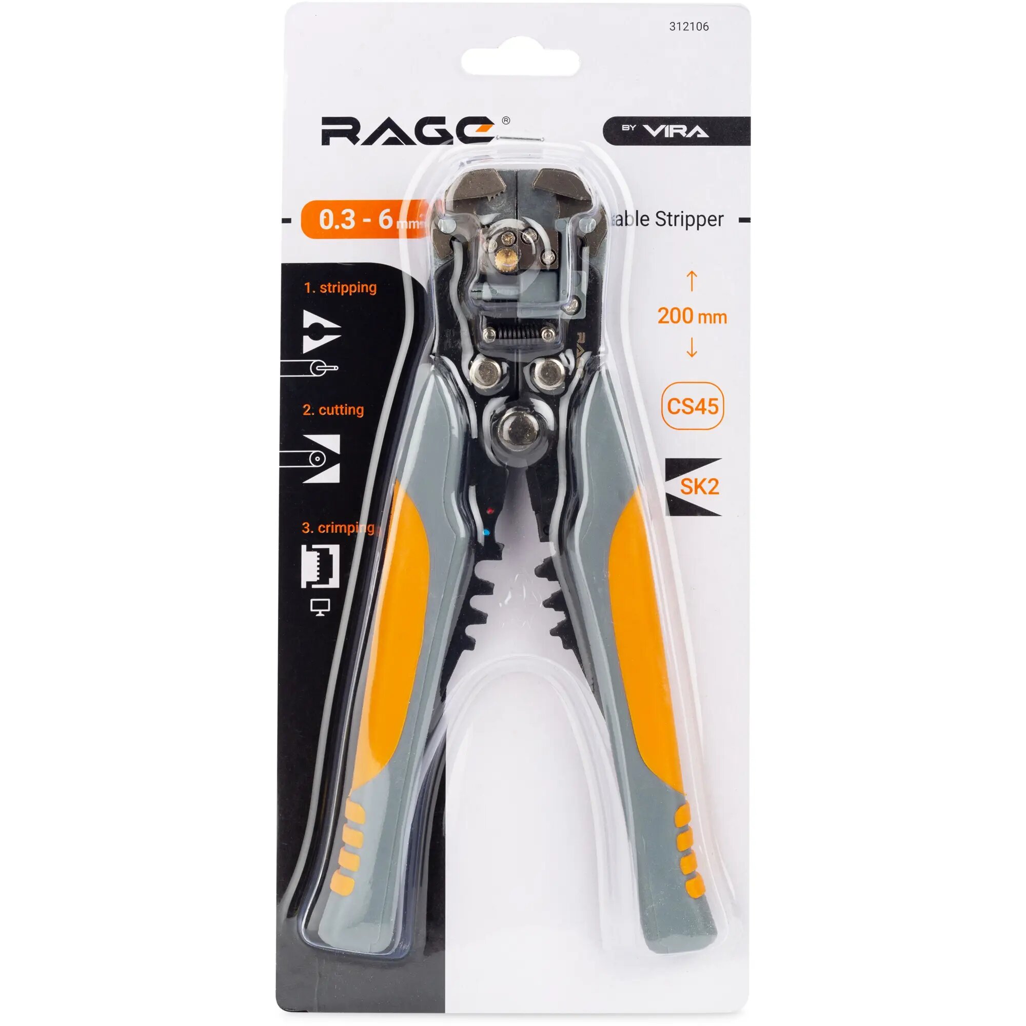 **Клещи Rage 312106** — зажимной инструмент. Предназначены для снятия изоляции, разрезания и обжима проводов. Модель отличается безопасностью в работе, не требует применения для поставленных задач дополнительных инструментов. Губки соединяются автоматически, что значительно облегчает процесс очистки от изоляции. При помощи регулировочного винта можно настроить необходимую силу рывка. Ограничителем регулируется длина снятия.