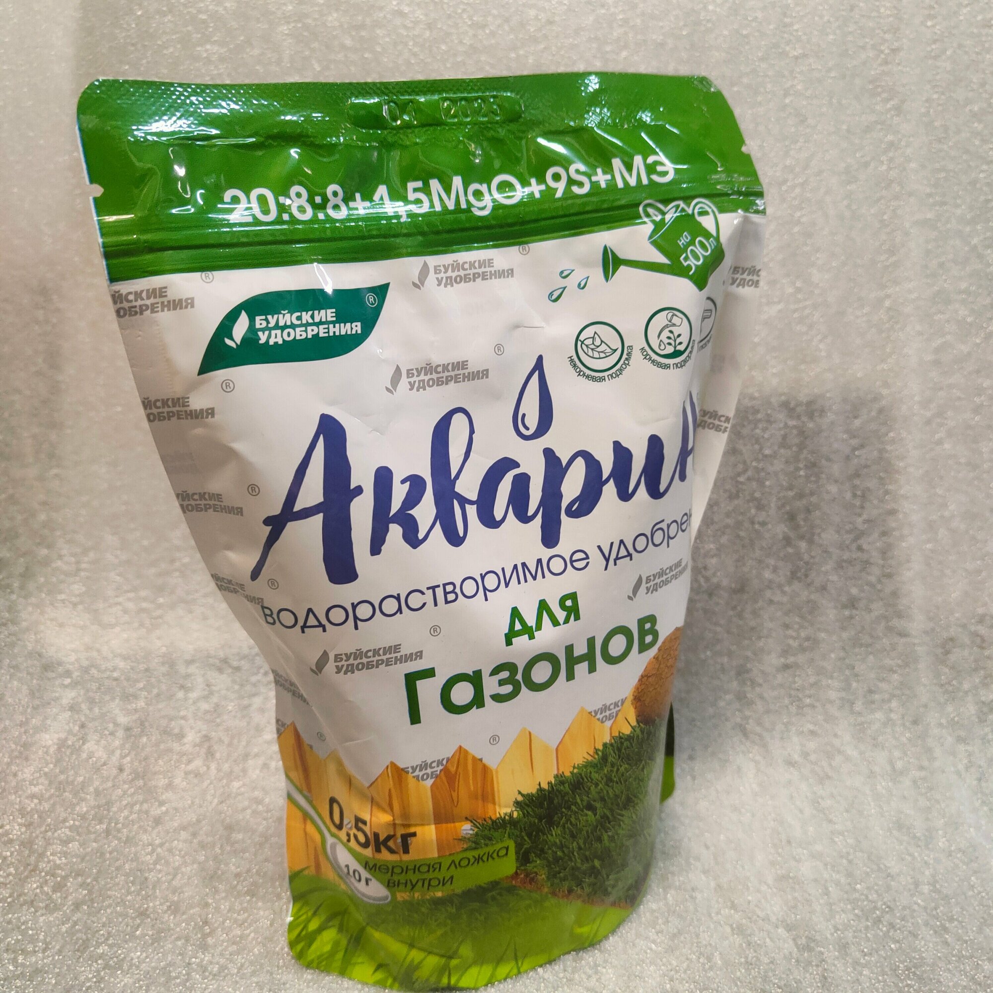**Удобрение Буйские удобрения Акварин** представляет собой порошок для изготовления жидкого раствора. Готовый препарат используется в качестве подкормки газона. Им можно поливать и орошать траву. Применяется в течение всего вегетационного периода. Состав: азот, фосфор, калий, магний, сера и микроэлементы – железо, цинк, марганец, медь, бор и молибден.