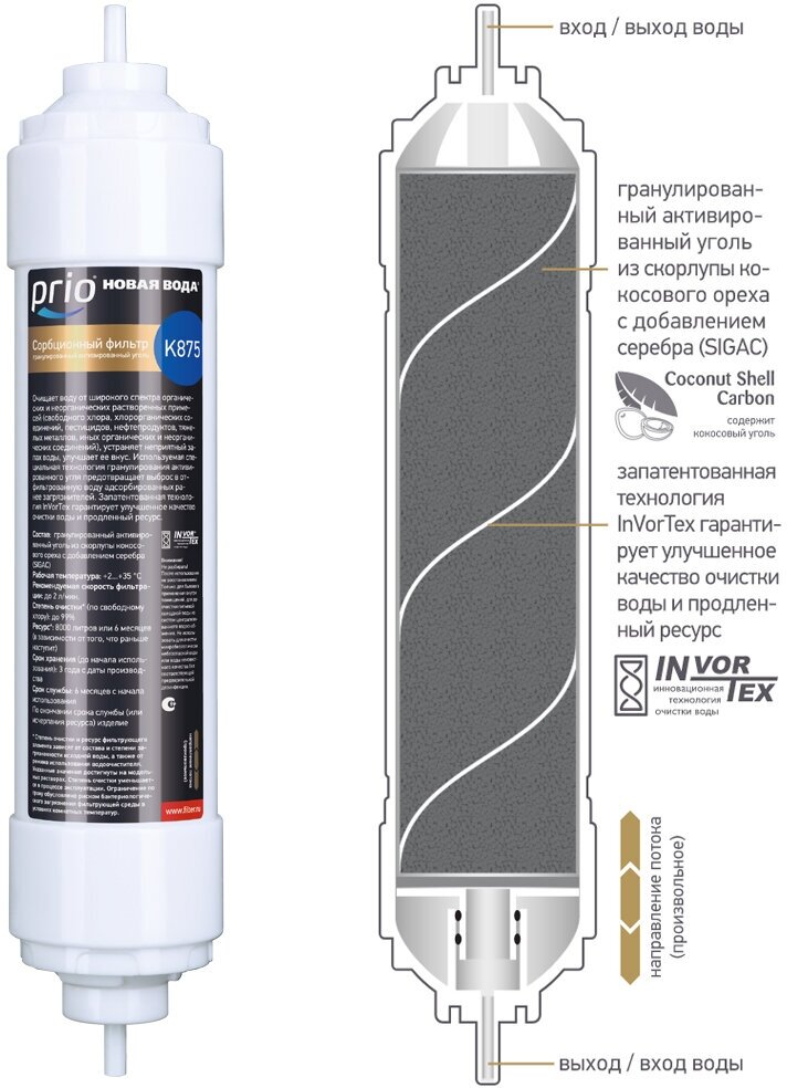 | Дополнительная информация | технология InVorTex® (движение воды по спирали внутри фильтрующего элемента) увеличивает путь воды в фильтрующей среде и продлевает время контакта воды с сорбентом |