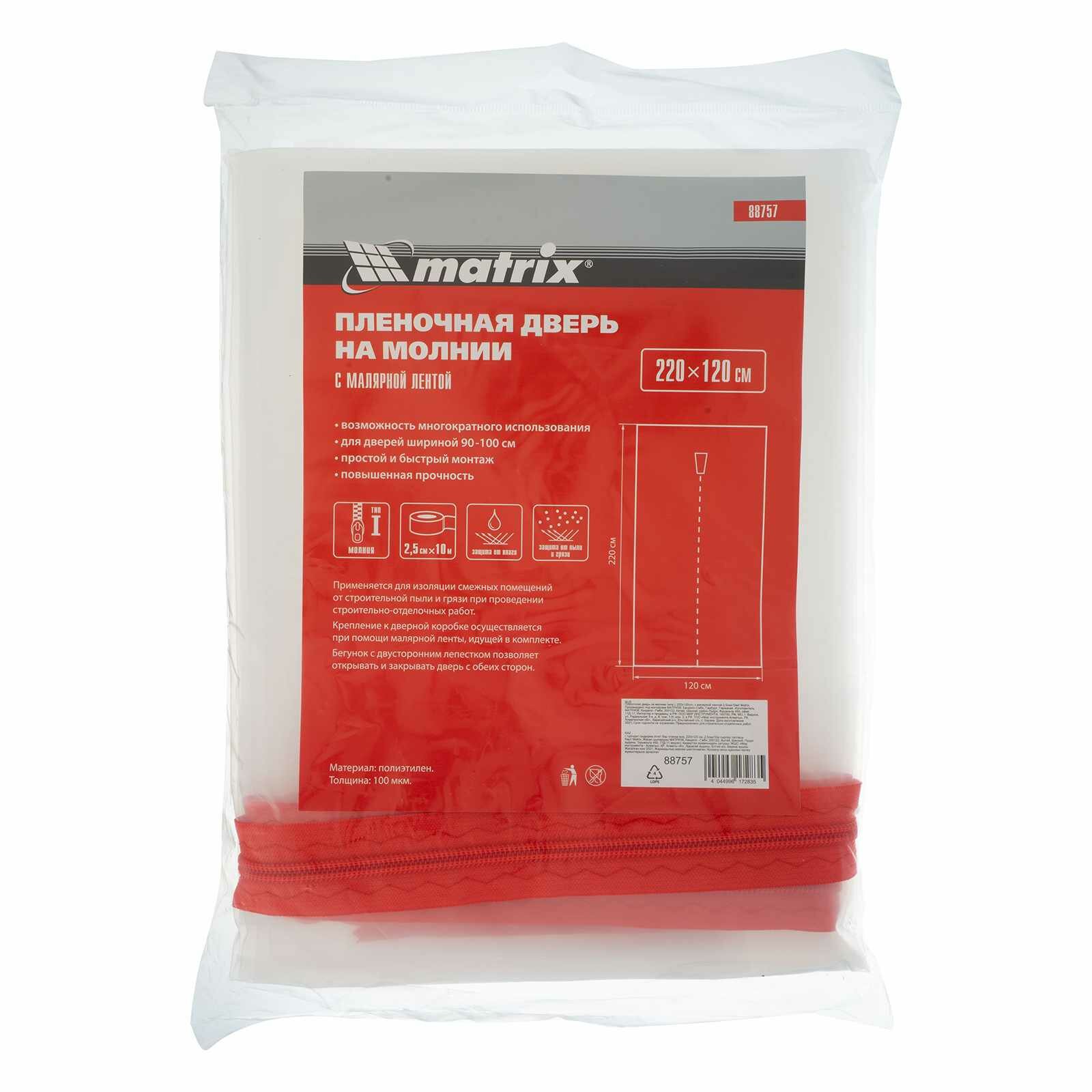 Пленочные двери на молнии используются при проведении различного рода строительно-отделочных работ для герметичной защиты смежных помещений от пыли и грязи. Крепление к дверной коробке осуществляется при помощи малярной ленты, идущей в комплекте.