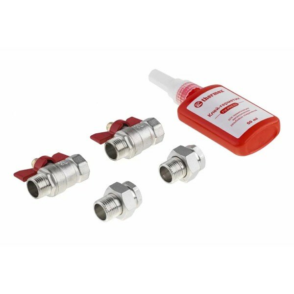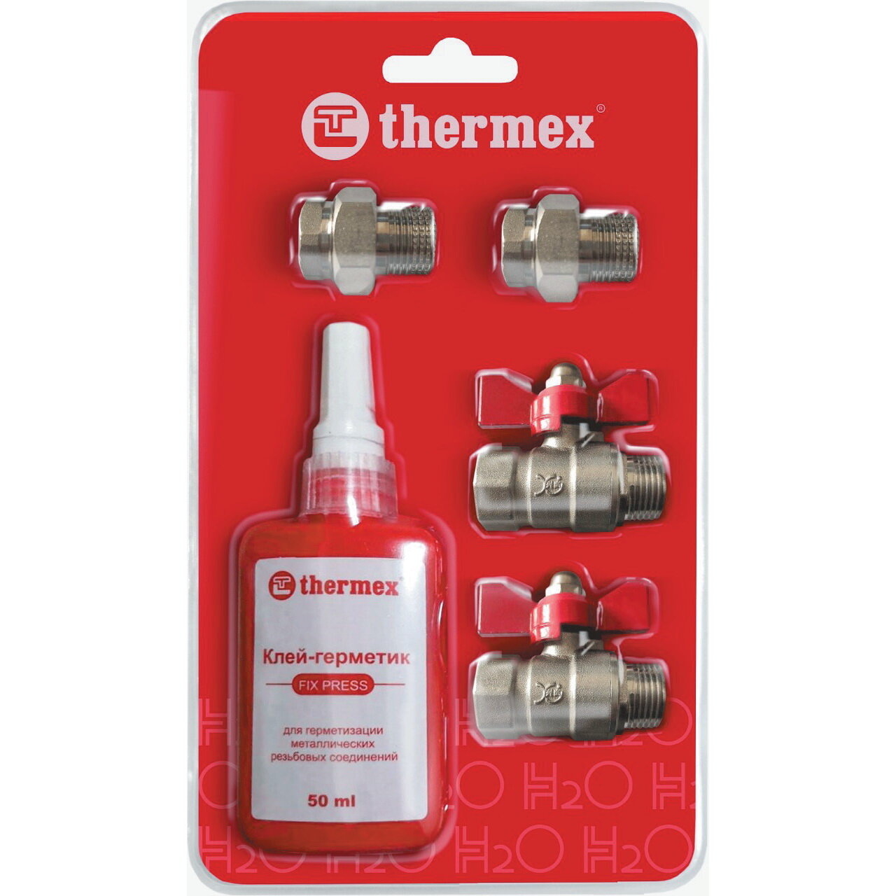 **Набор для монтажа водонагревателя Thermex** подходит для установки или ремонта всех проточных и накопительных водонагревателей с размером патрубков 1/2". Упрощает установку, монтаж и демонтаж устройств, обеспечивает возможность быстрого подключения водонагревателей в систему водоснабжения и отключение от нее. В состав входи анаэробный герметик, позволяющий герметично соединять элементы между собой.