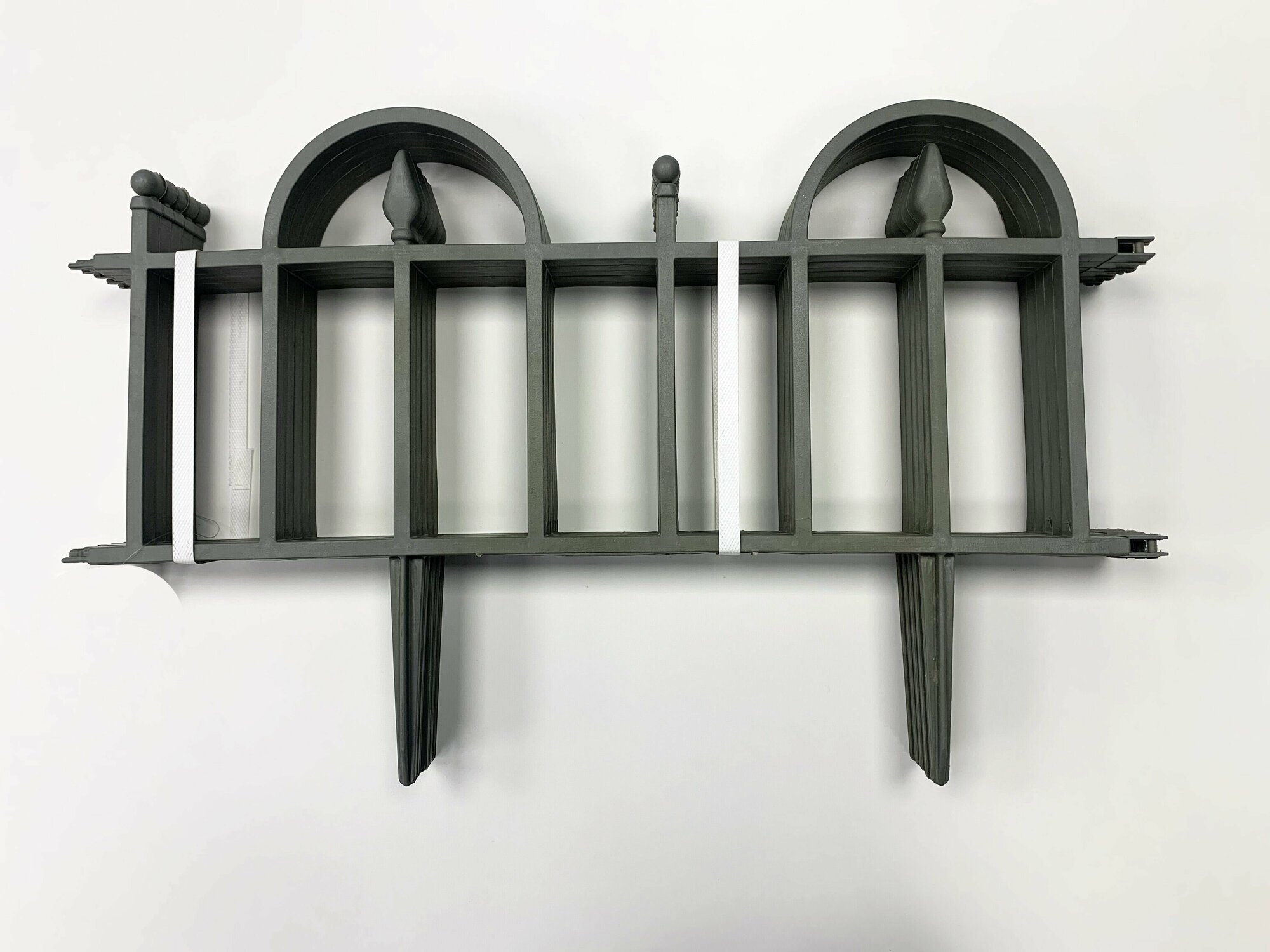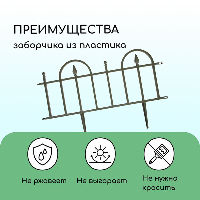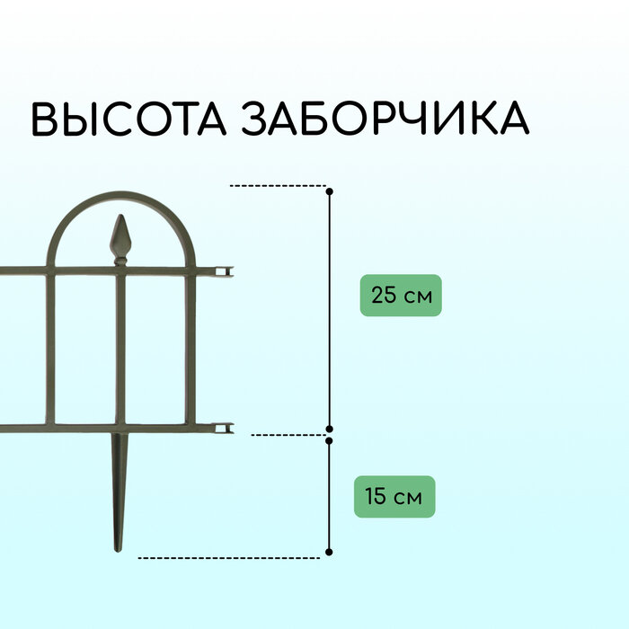 Заборчик садовый пластиковый декоративный состоит из сегментов по 60 см. Каждый заборчик имеет соединение с обоих сторон, что позволяет бесконечно соединять фрагменты заборчика в единое ограждение для грядок на даче, вокруг клумбы, вдоль дорожки, красиво и эстетично разграничить отдельные участки дачного участка или огорода. Ограждение для клумбы или ограждение для грядок изготовлены из полипропилена, что позволяет использовать заборчик на даче не один сезон. Заборчик имеет 2 надёжных и крепких колышка длиной 13 см, которые вставляются в грунт. При этом заборчик устойчиво фиксируется, создавая визуальную границу между грядками на огороде, либо разграничение между клумбой и садовой дорожкой высотой 26 см. Заборчик производится в России. Дизайн классический - имитация кованного забора.