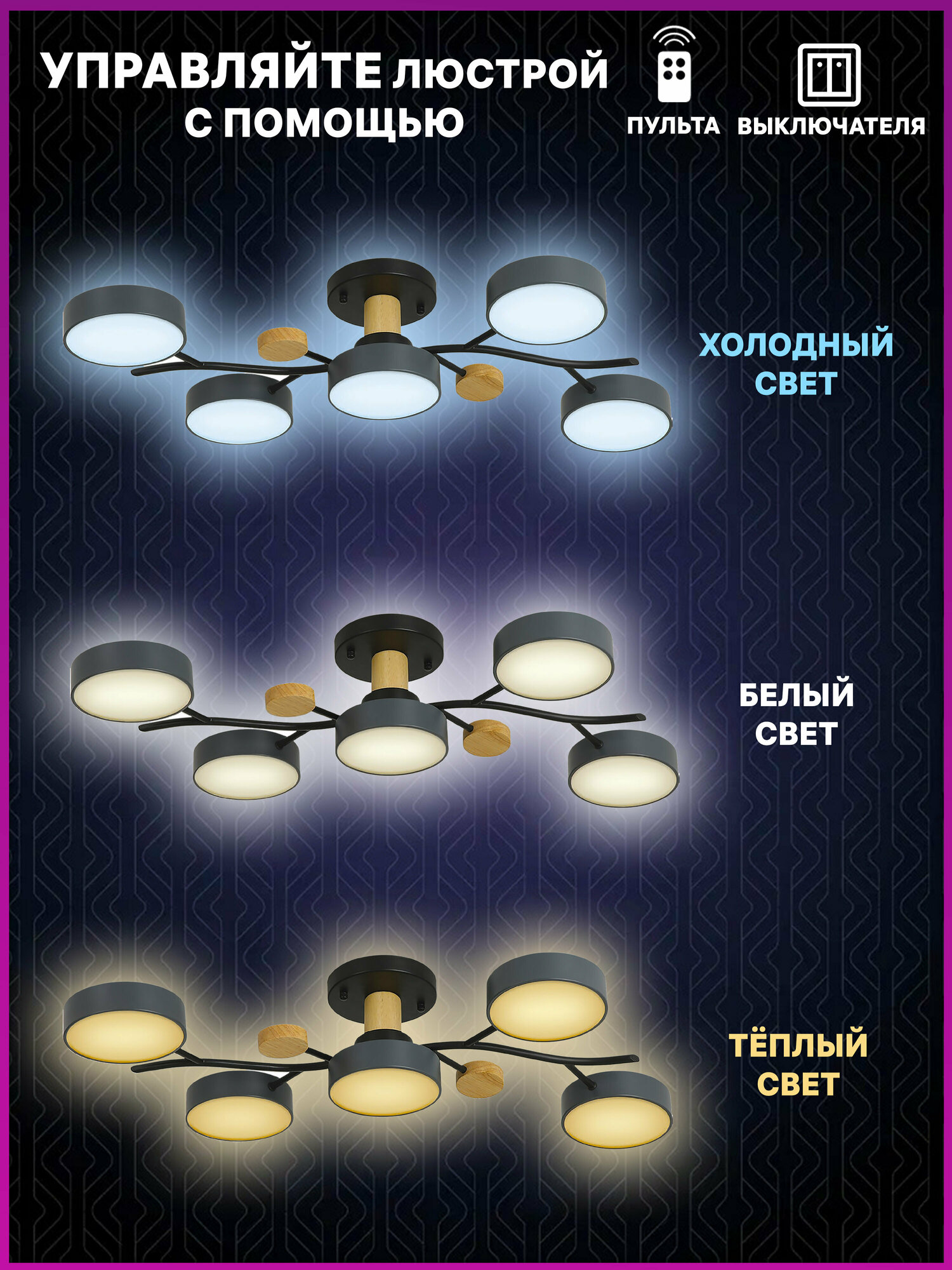 Светодиодная потолочная люстра серии SCANDIA от немецкого бренда Ritter - отличный выбор для любых помещений площадью до 25 кв. м Плафоны светильника соединены металлическими элементами со вставками из натурального дерева. Предусмотрена возможность изменения режима цветовой температуры при помощи пульта. Люстра относится к декоративно-художественному освещению. Остаётся только подобрать место, и светильник серии SCANDIA сам создаст атмосферу перфекционизма в вашем доме или офисе.