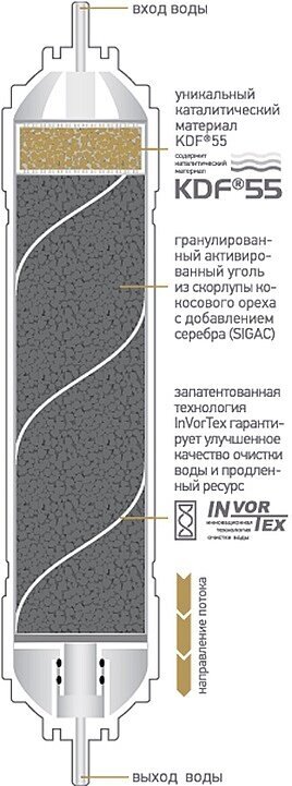 - Наиболее глубокую очистку от бактерий, хлора и тяжелых металлов обеспечивает уникальный патентованный материал KDF®55. KDF®55 выступает исключительно как катализатор, практически не расходуется в процессе работы, очищает воду от хлора путем восстановления его до ионов Cl-, защищает активированный уголь от бактериального загрязнения, а также удаляет из воды ионы большинства металлов, в том числе железа. KDF по ходу потока воды предшествует активированному углю и принимает на себя «первый удар» со стороны загрязнений, тем самым защищая следующие за ним активированный уголь и другие фильтрующие среды в последующих картриджах, продлевая их ресурс и увеличивая глубину очистки.