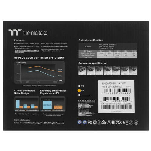 | Дополнительно * | Блок питания Thermaltake Toughpower SFX 750W [PS-STP-0750FNFAGE-1] рассчитан на мощность 750 Вт, что позволяет создавать компьютерные системы для работы, игры или учебы. Модель соответствует сертификации 80+ Gold, обеспечивает высокую энергоэффективность и производительность. Интерфейс PCIe 12+4pin позволяет устанавливать графические карты следующего поколения., Блок питания Thermaltake Toughpower SFX 750W [PS-STP-0750FNFAGE-1] имеет специальную пластину, которая подходит к креплению в корпуса с форм-фактором SFX. Активный вентилятор размером 92 мм обеспечивает бесшумное и своевременное охлаждение, создавая комфортные условия для бесперебойной работы системы. Модульное устройство имеет плоские кабели оптимальной длины, что позволяет подключать только необходимое оборудование и убирать лишнее. Японские конденсаторы устойчивы к повышенной температуре и препятствуют протечке электролита. |