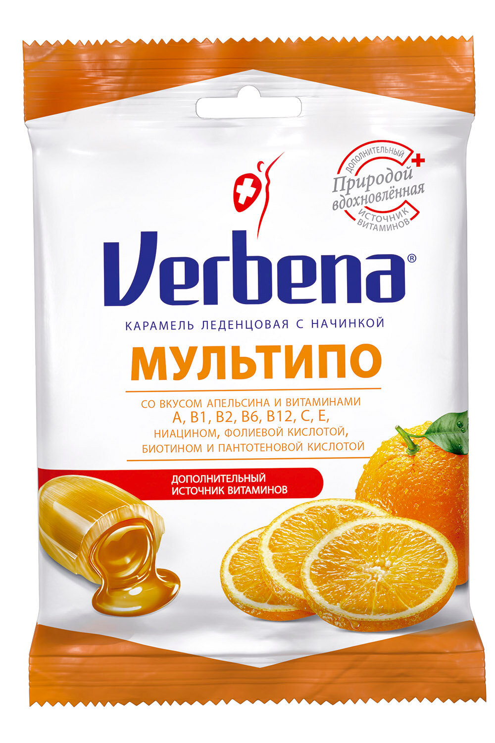 Действие Verbena Мультипо определяется свойствами входящих в её состав витаминов А, B1, B2, B6, B12, С, Е, ниацина, пантотеновой кислоты, фолиевой кислоты, биотина и апельсинового сока. Особая технология производства, при которой начинка варится отдельно, при более низких температурах, чем леденцовая основа, позволяет сохранить большее количество полезных экстрактов. Витамин С является одним из основных витаминов в рационе человека, необходимых для нормального функционирования и защиты организма. Он укрепляет иммунитет, усиливает устойчивость к инфекциям и уменьшает эффекты воздействия различных аллергенов на организм. Витамин A необходим для полноценного роста новых клеток в организме и замедляет процессы старения, является неотъемлемым элементом, позволяющим обеспечивать нормальное функционирование иммунной системы человека. Витамин B1 оказывает регулирующее влияние на нервную систему, принимает активное участие в процессах водно-солевого, белкового, углеводного, жирового и энергетического обмена. Витамин B2 принимает участие в углеводном, белковом, жировом и энергетическом обменах. В присутствии магния соединяется с белками, образуя ферменты, регулирующие клеточное дыхание. Необходим для созревания в костном мозге эритроцитов. Витамин B6 участвует во множестве биохимических реакций в качестве составной части ферментов, регулируя обмен жиров, углеводов и белков. Витамин B12 играет значимую роль в биологических процессах организма, совместно с другими витаминами участвует в обмене жиров, белков и углеводов. Очень важен для волос, их роста и здорового внешнего вида. Витамин Е остро необходим всем тканям организма. Он улучшает транспорт кислорода, регулирует свертываемость крови, препятствуя возникновению атеросклероза в сосудах. Антиоксидант принимает участие в работе мышечной системы человека, улучшает питание кожи, волос, ногтей и слизистых оболочек. Ниацин участвует в выработке энергии. С его помощью образуются особые ферменты, которые влияют на процессы преобразования энергии из углеводов. Способствуют контролю содержания глюкозы в крови. Пантотеновая кислота играет важную роль в формировании антител. Она принимает участие в синтезе нейротрансмиттеров и улучшает усвоение других витаминов. Фолиевая кислота восстанавливает иммунитет, поддерживает работу сердца и кровеносных сосудов, обеспечивает процесс образования клеток крови. Биотин оказывает стимулирующее действие на образование жирных кислот, а также на их переработку совместно с углеводами. Апельсиновый сок используется для профилактики авитаминозов, благотворно влияет на организм и поддерживает его защиту. Леденцы твёрдые, овальной формы, бледно - желтого цвета, с жидкой начинкой.