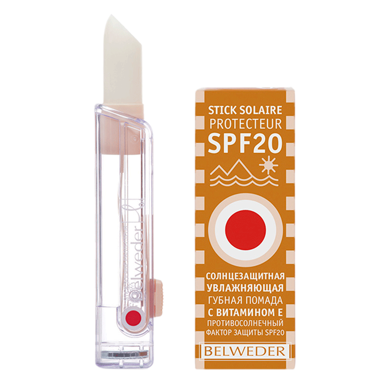 Белведер помада с/з SPF-20 увл. с вит. ЕЛекарственная формаСолнцезащитная увлажняющая губная помада Бельведер с витамином Е (противосолнечный фактор защиты SPF20)ключевые компоненты:- Фильтры противосолнечные - современные фильтры широкого спектра действия- Воски и масла натуральные: масло из семян хлопка, масло сладкого миндаля, ланолин, воск пчелиный, воск канделильский, воск карнаубский, - смягчают и восстанавливают эластичность кожи- Витамин Е – способствует восстановлению эластичности кожи, защищает клетки от фотостаренияСоставIsostearyl Isostearate, Cera Alba, Candelilla Cera, Ethylhexyl Methoxycinnamate, Gossypium Oil, Lanolin Cera, Bis-Diglyceryl Polyacyladipate-2, Copernica Cerifera Cera, Diethylamino Hydroxybenzoyl Hexyl Benzoate, Ozokerite, Ethoxydiglycol Oleate, C10-18 Triglycerides, Prunus Amygdalus Dulcis Oil, Titanium Dioxide (nano), Ethylhexyl Triazone, Octocrylene, Parfum, Silica, Citral.ПоказанияПомада Stick solaire protecteur гарантирует быстрый и ощутимый результат от использования действие:- С первого применения устраняет сухость, покраснение, шероховатость кожи губ.- Обеспечивает надежную защиту от фотостарения и действия неблагоприятных климатических и экологических условий- Разглаживает, регенерирует и увлажняет кожу губ- Формирует на губах тонкую нежирную защитную пленку- Ускоряет процесс заживления трещинок- Рекомендуется к регулярному применению в весенне-летний период, когда интенсивность солнечного облучения высока, а также все время пребывания в горах и у моря, при занятиях на открытом воздухе- Помада – водостойкаяДозировкаНанесите помаду на чистые губы перед выходом на улицу. Если Вы находитесь на открытом воздухе продолжительное время, используйте помаду несколько раз с интервалом в 3-4 часа. Помаду можно наносить в любое время при первых признаках дискомфорта (сухость, стянутость). Помада предназначена для использования в зимнее и летнее время в зависимости от интенсивности солнечного излучения.