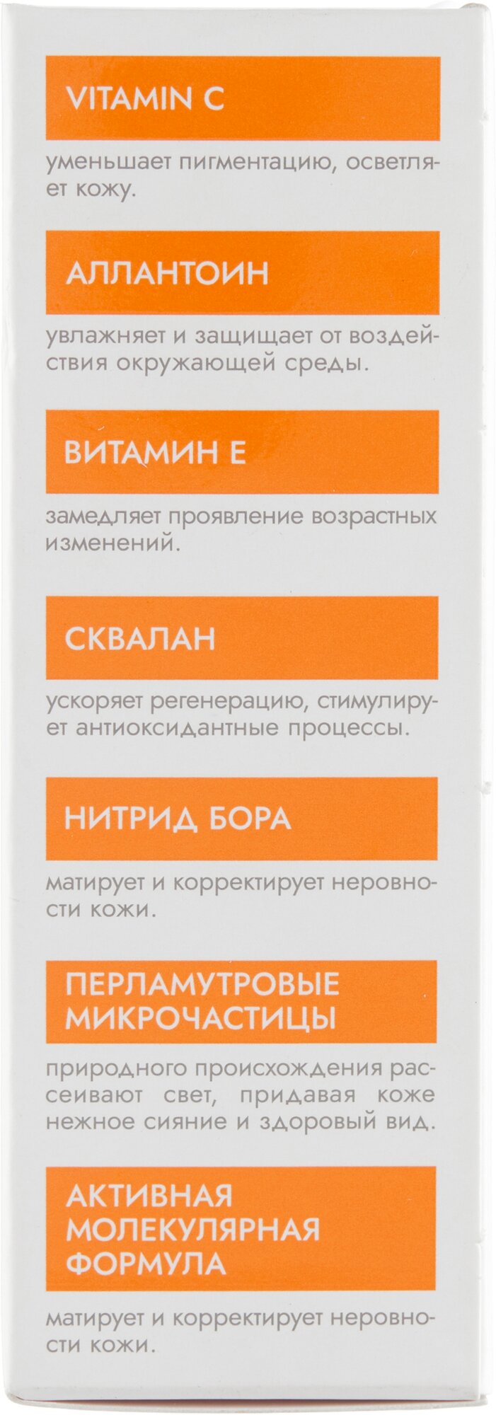 VITAMIN C уменьшает пигментацию, осветляет кожу.Аллантоин увлажняет и защищает от воздействия окружающей среды.Витамин Е замедляет проявление возрастных изменений.Сквалан ускоряет регенерацию, стимулирует антиоксидантные процессы.Нитрид бора матирует и корректирует неровности кожи.Перламутровые микрочастицы природного происхождения рассеивают свет, придавая коже нежное сияние и здоровый вид.Активная молекулярная формула повышает эластичность, улучшает цвет кожи, делая ее гладкой и здоровой.Входящие в состав средства компоненты придают коже молодой и сияющий вид, делают ее упругой и глубоко увлажненной. Подходит для ежедневного ухода за кожей любого типа.