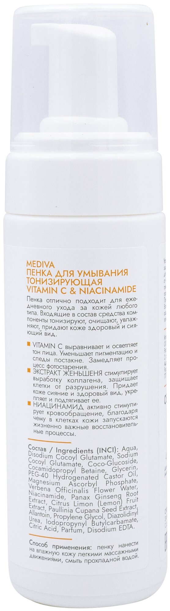 VITAMIN C выравнивает и осветляет тон лица. Уменьшает пигментацию и следы постакне. Замедляет процесс фотостарения.Экстракт женьшеня стимулирует выработку коллагена, защищает клетки от разрушения. Придает коже сияние и здоровый вид, укрепляет и подтягивает ее.Аллантоин прекрасно подходит для любого типа кожи, эффективно увлажняет и смягчает, защищает от воздействия окружающей среды.Пенку нанести на влажную кожу легкими массажными движениями, смыть прохладной водой.Пенка отлично подходит для ежедневного ухода за кожей любого типа. Входящие в состав средства компоненты тонизируют, очищают, увлажняют, придают коже здоровый и сияющий вид.