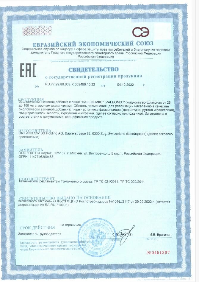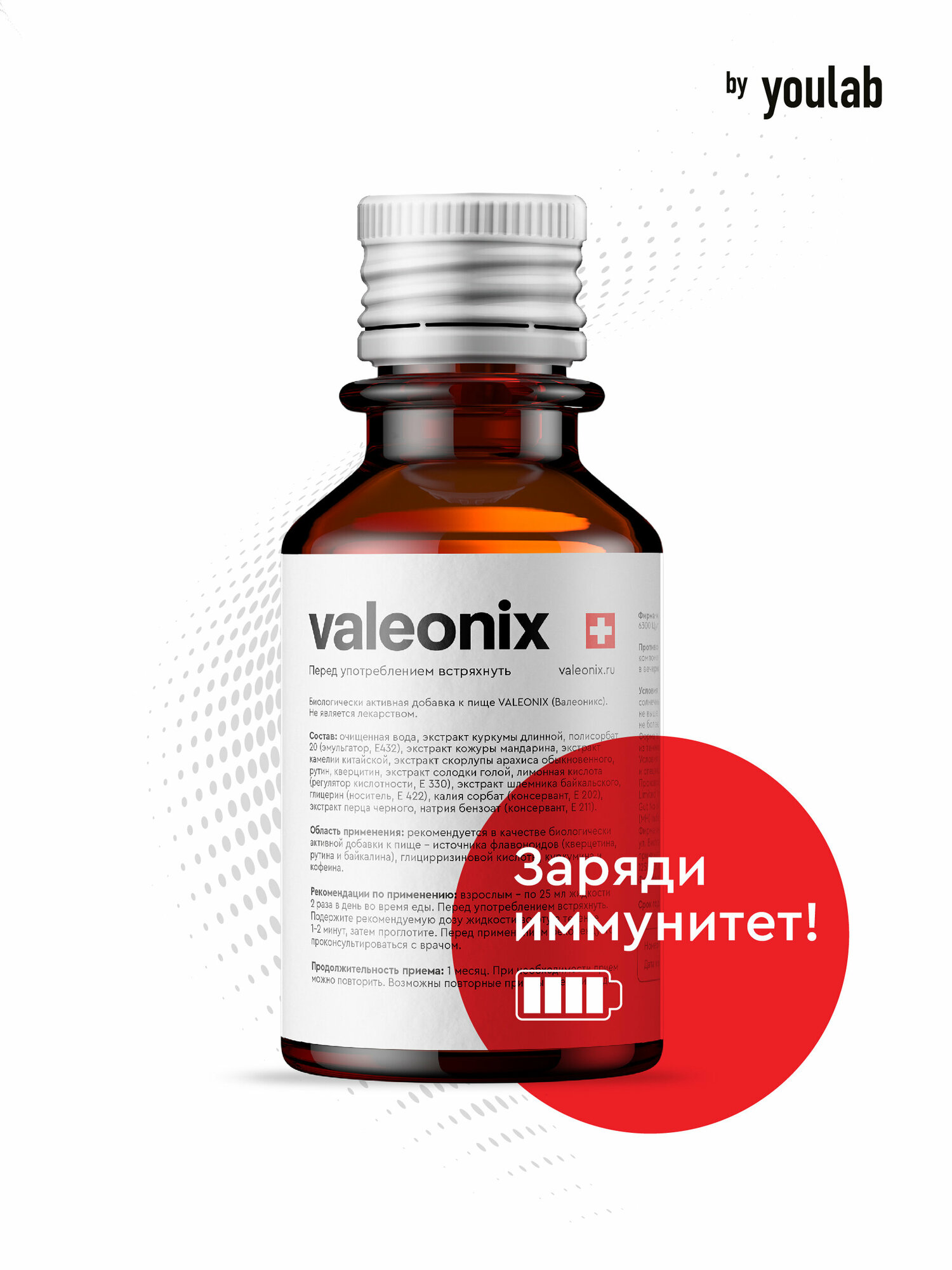 Описание товара: VALEONIX - фитонутрицевтик, созданный швейцарскими учеными на основе изучения свойств растительных антиоксидантов и природных молекул с антивирусной активностью, способствующий восстановлению организма после острых и длительно текущих вирусных заболеваний, включая грипп и COVID-19. Синергия действия инновационного комплекса антиоксидантов и растительных веществ позволяет безопасно и быстро восстановить функциональную активность клеток и тканей и существенно снизить проявления постковидного синдрома. Жидкая форма способствует быстрому усвоению активных веществ при пероральном приеме. Использование искусственного интеллекта и компьютерного анализа взаимодействия молекул позволило создать фитоформулу, компоненты которой работают в синергии, взаимно активируя друг друга и действуя там, где организм этого требует. Курсовой прием VALEONIX существенно снижает такие проявления постковидного синдрома как одышка, нарушения сна, головокружение, хроническая усталость, кашель, когнитивные нарушения. Характеристики товара: • Разработан в Швейцарии • 100% натуральный состав • Активные вещества с доказанным антивирусным эффектом
