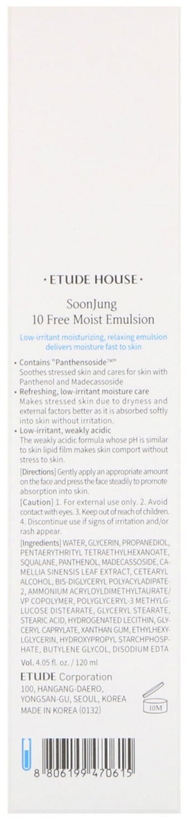 Etude SoonJung 10 Free Moist Emulsion Гипоаллергенная эмульсия для чувствительной кожи. Увлажняющая релаксирующая эмульсия для сухой, чувствительной и поврежденной частыми стрессами и плохой экологией кожи имеет нежнейшую, невесомую текстуру молочка и слабокислотную, не вызывающую раздражений, формулу, содержит 93% натуральных ингредиентов. Активные компоненты: Комплекс Panthensoside (пантенол, мадекассосид) восстанавливает водно-липидный баланс кожи, ускоряет регенерацию и заживление, предупреждает образование шрамов и рубцов, оказывает антиоксидантное, противовоспалительное и антибактериальное действие, восстанавливает плотность и эластичность. Комплекс Dust Cut устраняет признаки стресса, дискомфорт и сухость, расслабляет, смягчает и успокаивает кожу, нежной консистенцией и высоким содержанием активных веществ, эмульсия насыщает ткани влагой, ускоряет их заживление, с помощью лецитина восстанавливает и укрепляет эпидермальный защитный барьер. Средство без искусственных красителей, силикона и отдушек эффективно оздоравливает и продлевает молодость кожи. Как пользоваться: Нанести на очищенную кожу, равномерно распределить похлопывающими движениями.