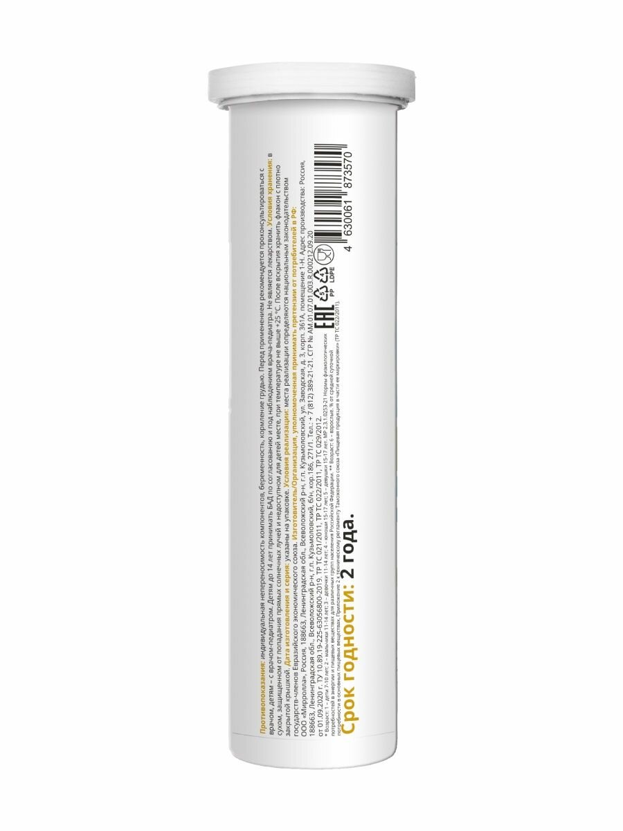 | Состав | Лимонная кислота (регулятор кислотности), натрия гидрокарбонат (регулятор кислотности), глюкоза (наполнитель), аскорбиновая кислота, ароматизатор натуральный апельсина, краситель (бета каротин), сукралоза (подсластитель), никотинамид, токоферола ацетат, кальция пантотенат, пиридоксина гидрохлорид, рибофлавин, тиамина гидрохлорид, фолиевая кислота, холекальциферол, цианокобаламин. |