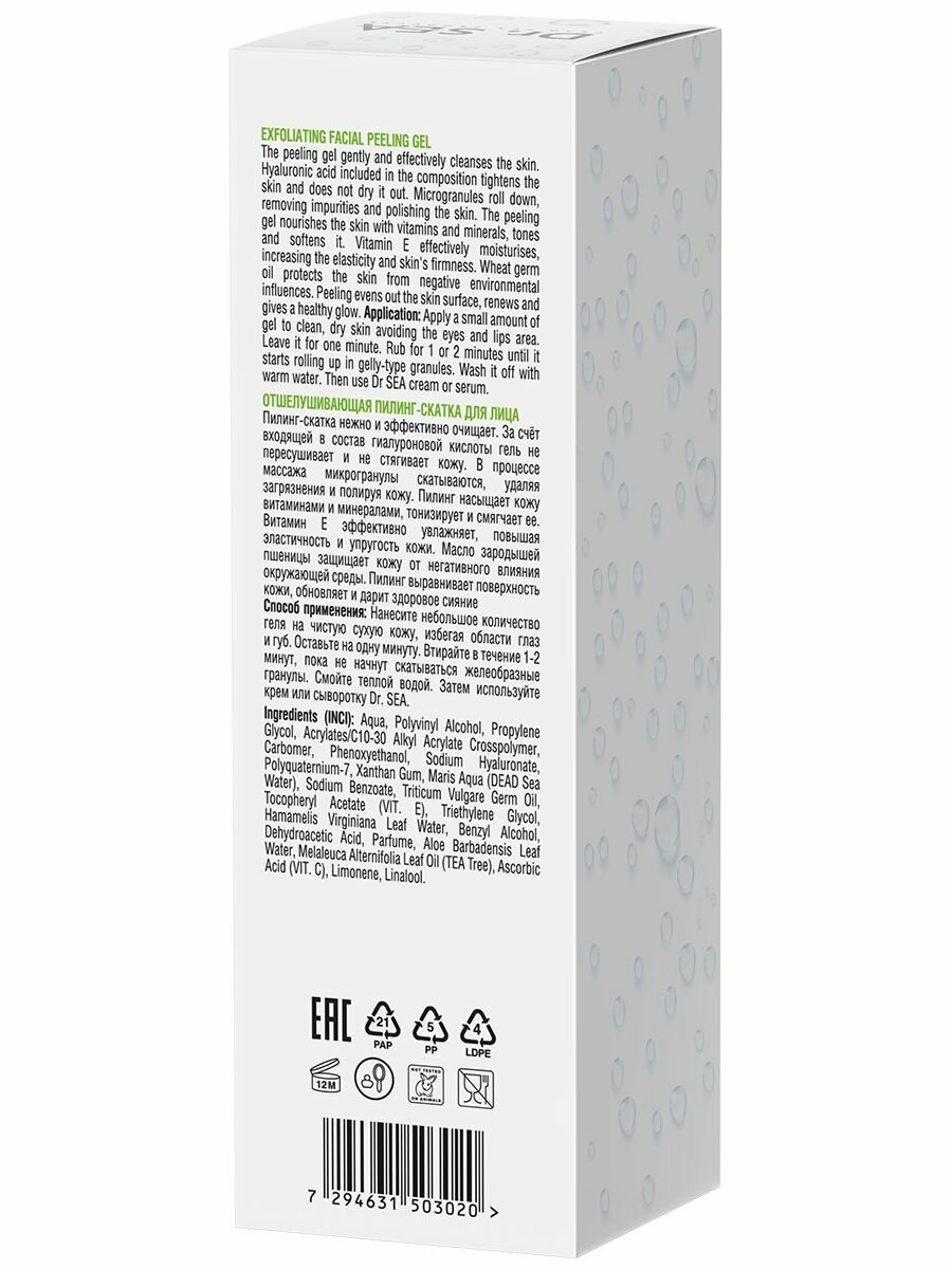 Отшелушивающее средство с гиалуроновой кислотой для удаления загрязнений и остатков макияжа. Средство для бережной эксфолиации отшелушивает омертвевшие чешуйки кожи и при этом действует очень деликатно, потому что не содержит абразивных частиц, в отличие от классического скраба. В состав входит активная гиалуроновая кислота, которая не сушит и не стягивает дерму после умывания, а также помогает сохранить ее увлажненной в течение всего дня. Витамин Е эффективно увлажняет, повышая эластичность и упругость. Масло зародышей пшеницы защищает эпидермис от негативного влияния окружающей среды. В процессе распределения и легких массажных движений микрогранулы скатываются, удаляя загрязнения, полируя и выравнивая поверхность кожи. Пилинг обновляет и дарит здоровое сияние. Подходит для ежедневного применения.Способ применения:Нанесите небольшое количество геля на чистую сухую кожу, избегая области глаз и губ. Оставьте на одну минуту. Втирайте в течение 1-2 минут, пока не начнут скатываться желеобразные гранулы. Смойте теплой водой. Затем используйте крем или сыворотку.Состав:Aqua, polyvinyl alcohol, propylene glycol, acrylates/c10-30, alkyl acrylate crosspolymer, carbomer, phenoxyethanol, sodium hyaluronate, polyquaternium-7, xanthan gum, maris aqua (dead sea water), sodium benzoate, triticum vulgare (wheat) germ oil, tocopheryl acetate (vit. E), triethylene glycol, hamamelis virginiana leaf water, benzyl alcohol, dehydroacetic acid, parfume, aloe barbadensis leaf water, melaleuca alternifolia leaf oil (tea tree), ascorbic acid (vit. C), limonene.