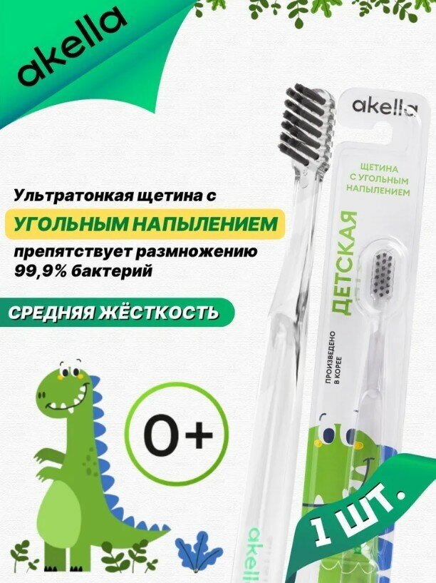 Уникальная детская зубная щетка от бренда AKELLA будет радовать вашего малыша не только красивым дизайном, но белоснежными зубками! Щетинки зубной щётки имеют специальное угольное покрытие и изготовлены по запатентованной технологии на инновационном заводе в Южной Корее.Щетина изготовлена на высокоточном оборудовании и толщина щетинок составляет всего лишь 0,15мм +/- 0,015 мм - это позволяет максимально глубоко проникать между зубами, прочищая недоступные полости и массирую десны. За счет угольного напыления щётка максимально эффективно отчищает зубной налет и дезинфицирует полость рта, препятствуя размножению (99,9 %) бактерий. Зубные щетки сертифицированы и прошли все клинические испытания.Нашу продукцию рекомендуют родители и стоматологи!