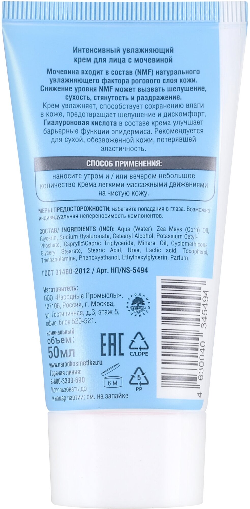Интенсивный увлажняющий крем для лица с мочевиной. Мочевина входит в состав (NMF) натурального увлажняющего фактора рогового слоя кожи. Снижение уровня NMF может вызвать шелушение, сухость, стянутость и раздражение. Крем увлажняет, способствует сохранению влаги в коже, предотвращает шелушение и дискомфорт. Гиалуроновая кислота в составе крема улучшает барьерные функции эпидермиса. Рекомендуется для сухой, обезвоженной кожи, потерявшей эластичность.