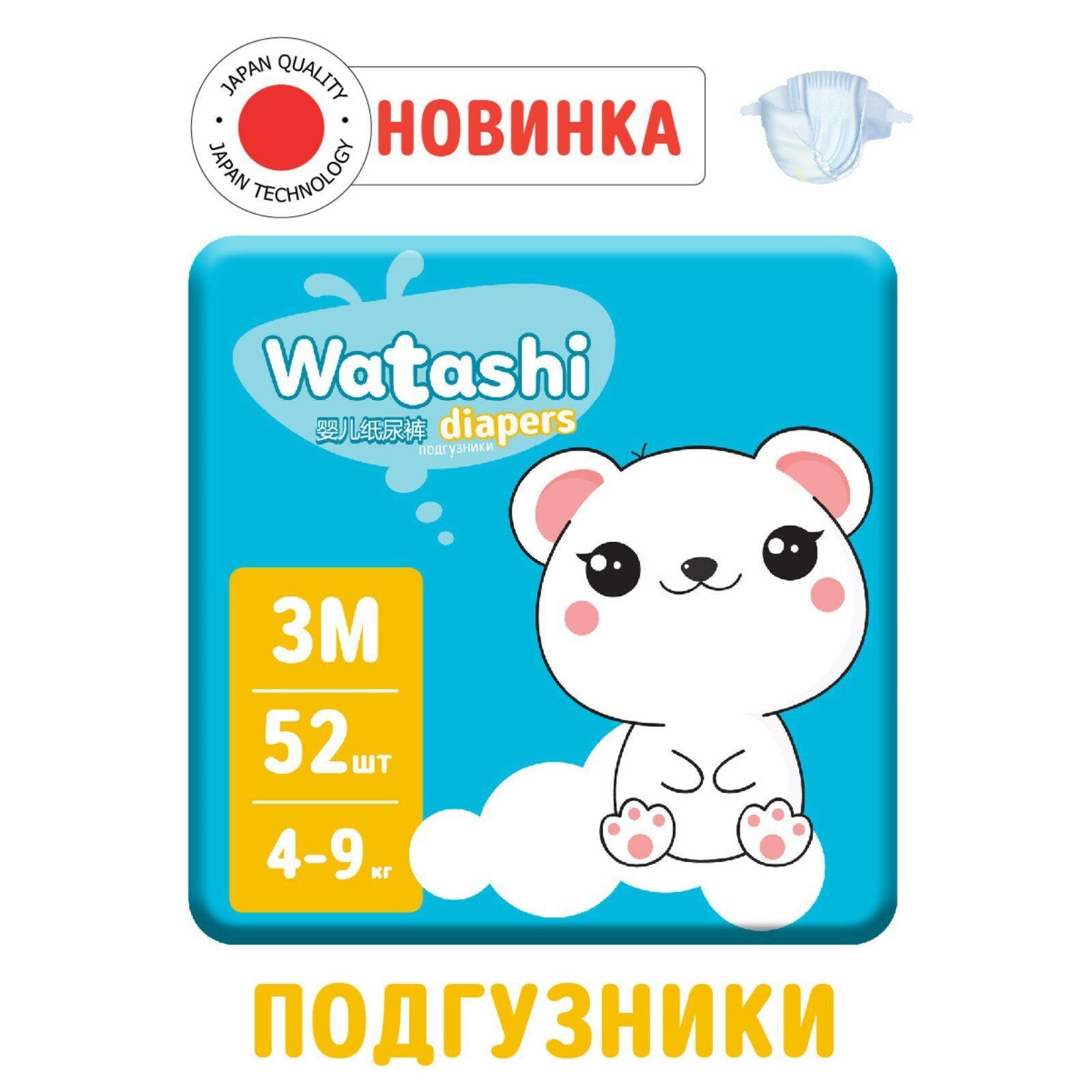 Подгузники WATASHI нового поколения разработаны по японской технологии. В производстве использован лучший японский суперабсорбент на рынке SUMITOMO. Именно он отвечает за впитываемость трусиков и обеспечивает сухие дни и ночи для малыша. AQUA STOP - Запатентованная технология впитывающих каналов. Каналы быстро распределяют воду, не образуя комочков и провисаний. Внутри текстурированный 3D слой для ваших самых нежных зайцев! Дышащий слой защищает кожу от испарений и обеспечивает идеальную терморегуляцию. Высокие внутренние барьерчики не позволят содержимому вытечь наружу. Анатомическая форма - отлично сидят, не сползают, не сковывают движений, не вызывают дискомфорта. Широкий эластичный поясок мягко облегает, не оставляя следов на коже. Индикатор наполнения - незаменимый помощник родителям, он сообщит вам, когда пора сменить подгузник. Многоразовые липучки анатомической формы крепко фиксируют подгузник на теле. Подходят для использования как днем, так и ночью.