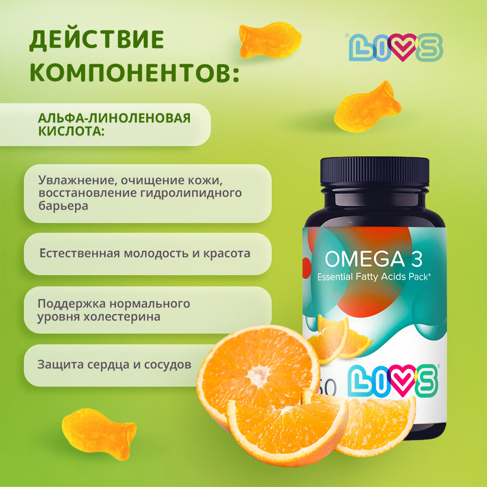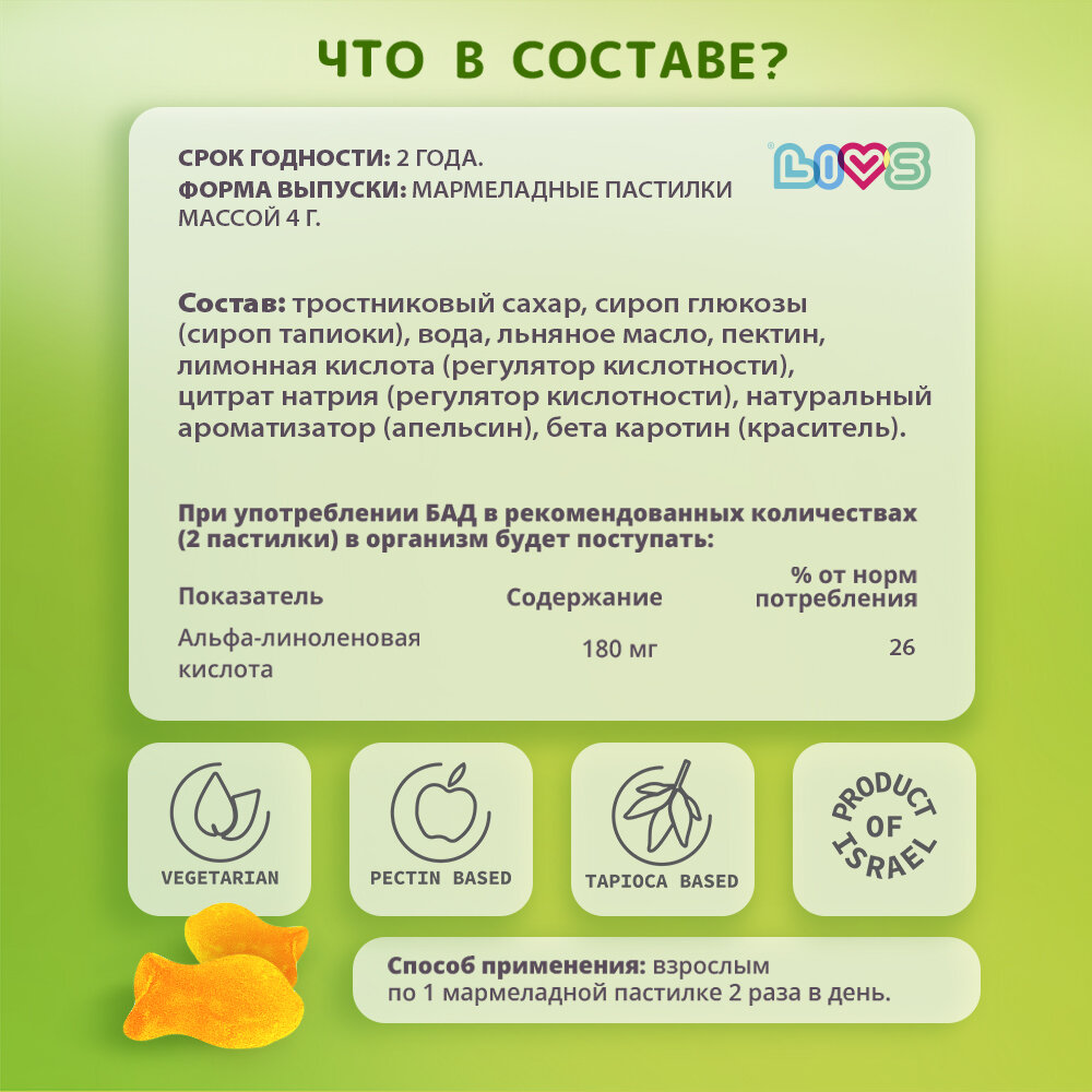 Витамины LIVS омега 3 для иммунитета и поддержания естественной красоты в жевательных мармеладных пастилках на основе пектина. Нежные, вкусные, без искусственных красителей omega 3 витамины, имеют бодрящий вкус апельсина. БАД не содержит потенциальных аллергенов, в составе только натуральные, органические компоненты. Витаминный комплекс LIVS Омега 3 способствует: • усилению защитных сил организма, • поддержанию естественной красоты и молодости кожи, • защите сердца и сосудов. • Поддержанию организма в здоровом состоянии и форме Биодобавка подходит мужчинам и женщинам, а также молодым девушкам и парням (подросткам с 18 лет). Проходит строгий контроль качества производства в соответствии с международными стандартами: GMP, ISO, HACCP, содержит отборное сырье высочайшего качества, в качестве красителей используются натуральные порошки и соки фруктов и овощей, органического происхождения, подходит для вегетарианцев, кошерная, имеет сертификат Халяль, не содержит потенциальных аллергенов, глютена, желатина, без ГМО, искусственных ингредиентов и консервантов. Все комплексы LIVS: • произведены в Израиле • имеют натуральный, органический состав • не содержат ГМО и аллергенов • имеют сертификаты кошер и халяль, подходят для вегетарианцев • произведены в форме мармеладных пастилок, что облегчает процесс приема и не вызывает раздражений при проглатывании • имеют приятный фруктовый вкус • бережно упакованы в пластиковые баночки с контролем вскрытия и защитой от детей Порадуйте себя, свою семью или друзей вкусными и полезными витаминами.