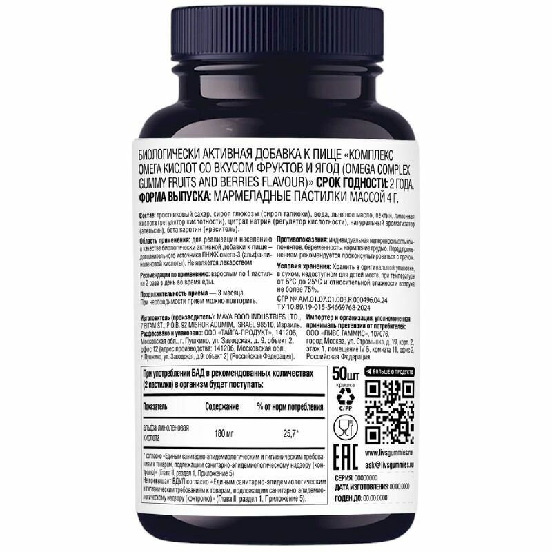 Омега кислоты комплекс фрукты и ягоды LIVS пастилки жевательные 4г 50шт MAYA FOOD INDUSTRIES LTD (2170368) (размер: Без размера)