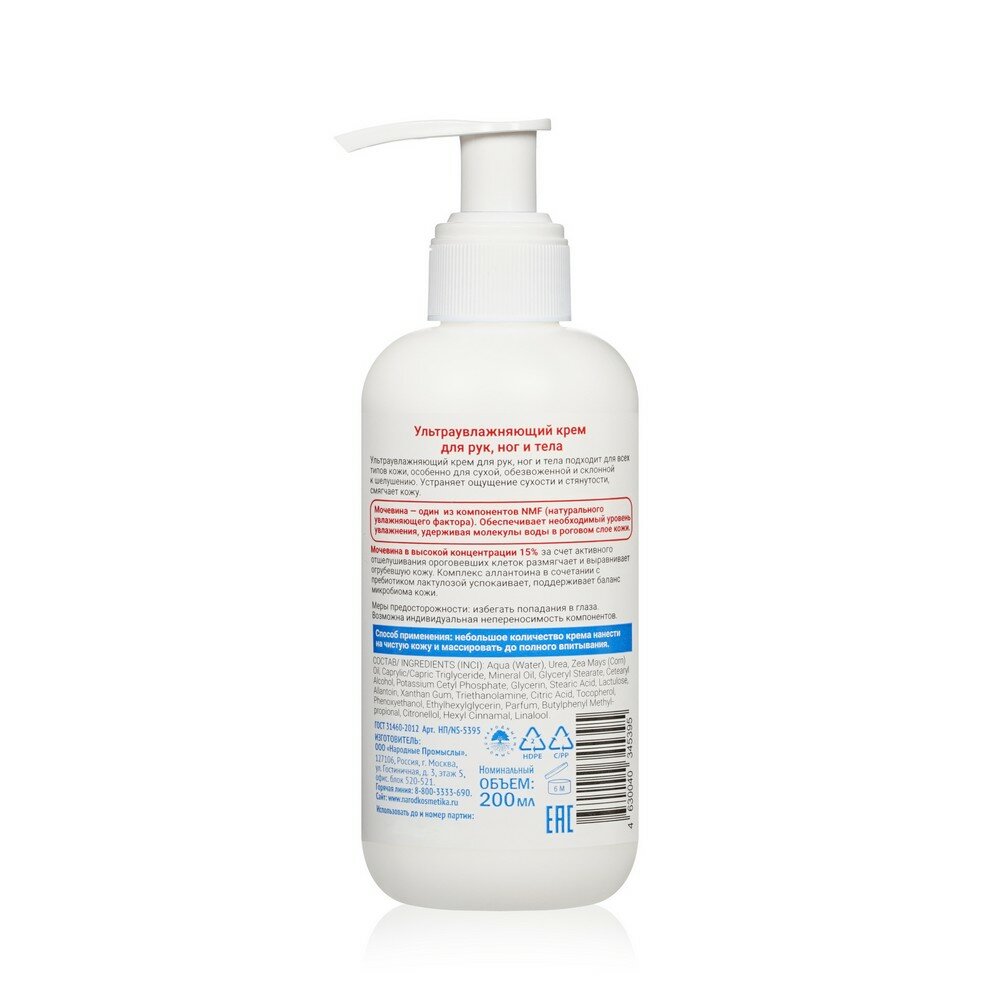 "Ультраувлажняющий крем для рук, ног и тела подходит для всех типов кожи, особенно для сухой, обезвоженной и склонной к шелушению. Устраняет ощущение сухости и стянутости, смягчает кожу. Мочевина -- один из компонентов NMF (натурального увлажняющего фактора). Обеспечивает необходимый уровень увлажнения, удерживая молекулы воды в роговом слое. Мочевина в высокой концентрации 15% за счет активного отшелушивания ороговевших клеток размягчает и выравнивает огрубевшую кожу. Комплекс аллантоина в сочетании с пребиотиком лактулозой успокаивает, поддерживает баланс микробиома кожи. "