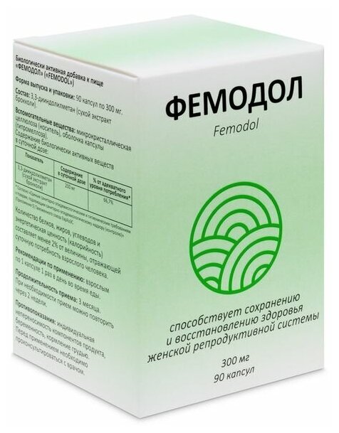 Новая упаковка! Фемодол натуральный негормональный БАД для женщин. За счет поддержания оптимального баланса эстрогенов обеспечивает профилактику заболеваний женской репродуктивной системы и молочных желез.Фемодол - новое поколение индолов!Назначение: для предупреждения заболеваний, вызванных вирусом папилломы человека (ВПЧ), заболевания молочных желез, недостаточность функций половых желез, улучшение функционального состояния молочных железФармакологическое действие: Активное вещество в составе Фемодола - 3,3-дииндолилметан — стабильная форма индолов. Индол-3-карбинол — это органическое соединение, которое содержится в овощах семейства крестоцветных (капусте, кольраби, репе, брюкве, редисе).Индол превращается в 3,3 дииндолилметан в желудке в течение первых минут контакта с желудочным соком, таким образом именно 3,3 дииндолилметан обеспечивает основные полезные эффекты индолов в сохранении здоровья женской репродуктивной системы (молочная железа, эндометрий, миометрий, шейка матки, яичники).3,3 дииндолилметан запускает синтез эстрогенов по безопасному пути, в результате образуется больше эстрогенов с положительным влиянием на организм. Клинические исследования подтвердили, что пероральный прием 3,3 дииндолилметана в 2 раза уменьшает болезненность и нагрубание молочных желез перед менструацией.Длительное поддержание оптимального баланса метаболитов эстрогенов является профилактикой развития онкологических заболеваний.Фемодол - содержит 200 мг очищенного 3,3 дииндолилметана, что эквивалентно 400 мг Индол-3-карбинола. Т.к. из двух молекул индол-З-карбинола образуется одна молекула 3,3-дииндолилметана, допускается, что 200 мг 3,3-дииндолилметана эквивалентно 400 мг индол-З-карбинола.Переносимость 3,3 дииндолилметана лучше, по сравнению с индолами, так как он напрямую усваивается в организме. Индол при взаимодействии с желудочным соком образует примеси, содержащие формальдегид, что может вызывать тошноту и другие подобные реакции.Фемодол может применяться как дополнительное средство к назначенной терапии. Или после основной терапии в качестве поддерживающего средства. Дополнительная информация:Природный нутрицевтик.Международная практика применения: для предупреждения заболеваний, вызванных вирусом папилломы человека (ВПЧ), для снижения веса, и лечения акне. Препараты содержащие ДИМ ускоряют процессы метаболизма и способствуют расщеплению жиров. А также, обладают высокими антиоксидантными свойствами.Не содержит химических красителей и консервантов. Не содержит лактозу. Препарат подходит для вегетарианцев.БАД не является лекарством. Перед применением проконсультируйтесь с врачом.