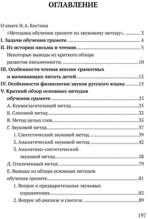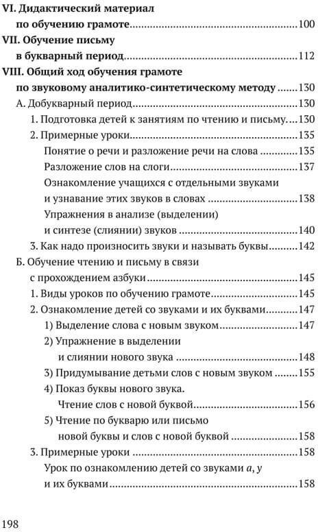 Обучение грамоте по звуковому аналитико-синтетическому методу делится на два периода: добукварный и азбучный. Для каждого этапа в пособии обозначены задачи и цели учителя, даны рекомендации по подготовке к занятиям и примеры уроков. После прохождения азбуки закрепление навыков достигается чтением небольших рассказов, сказок и стихотворений.
