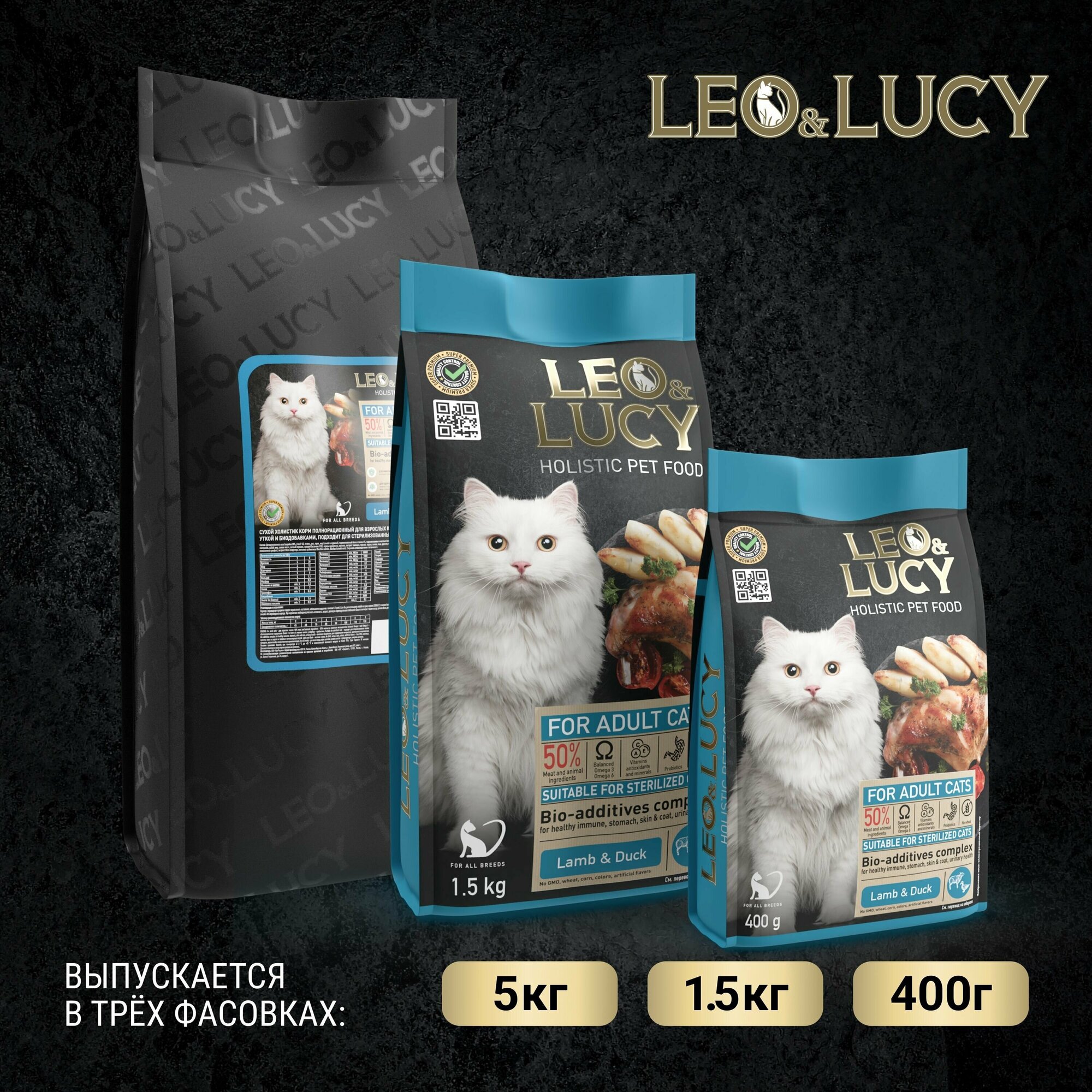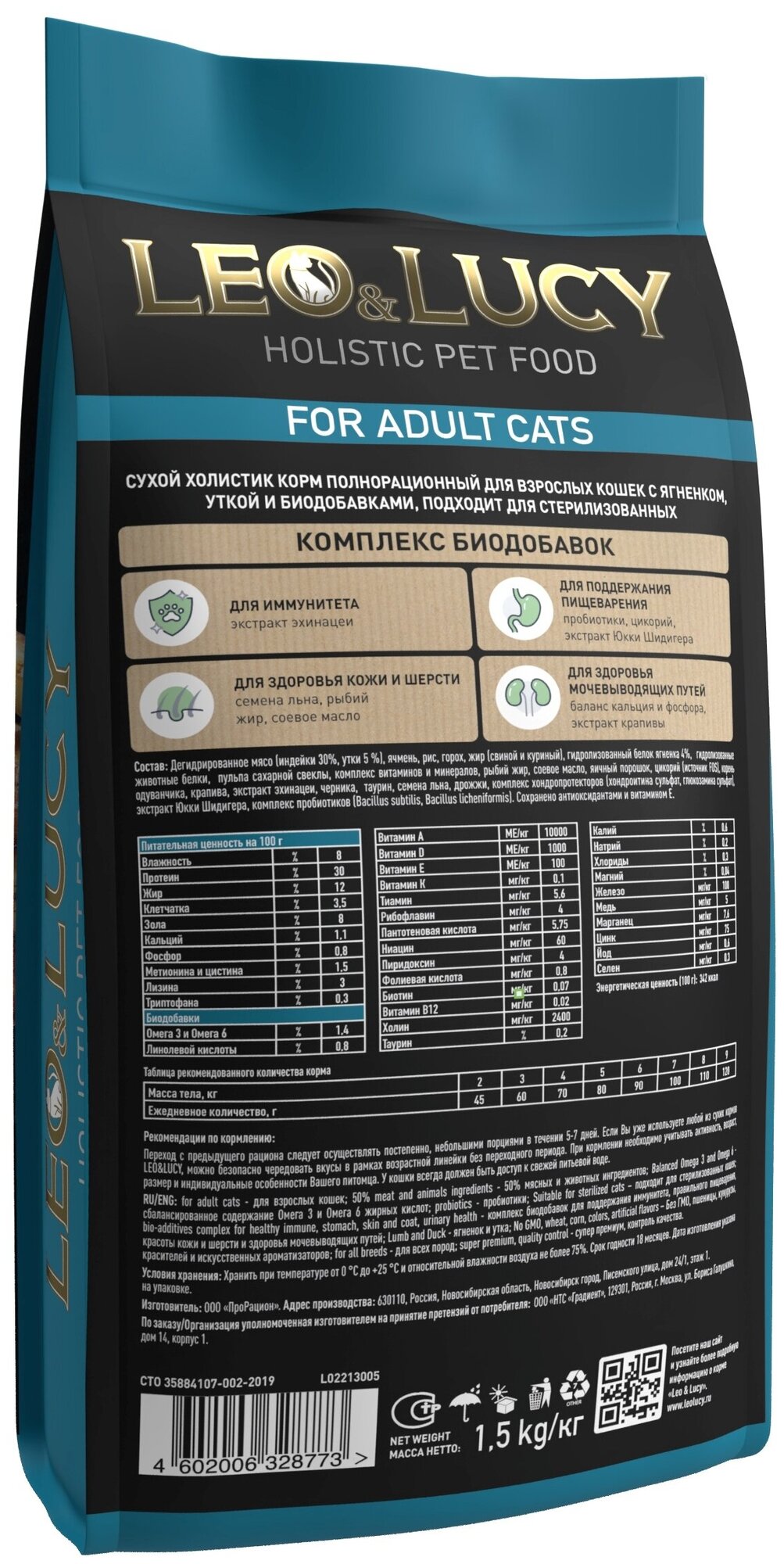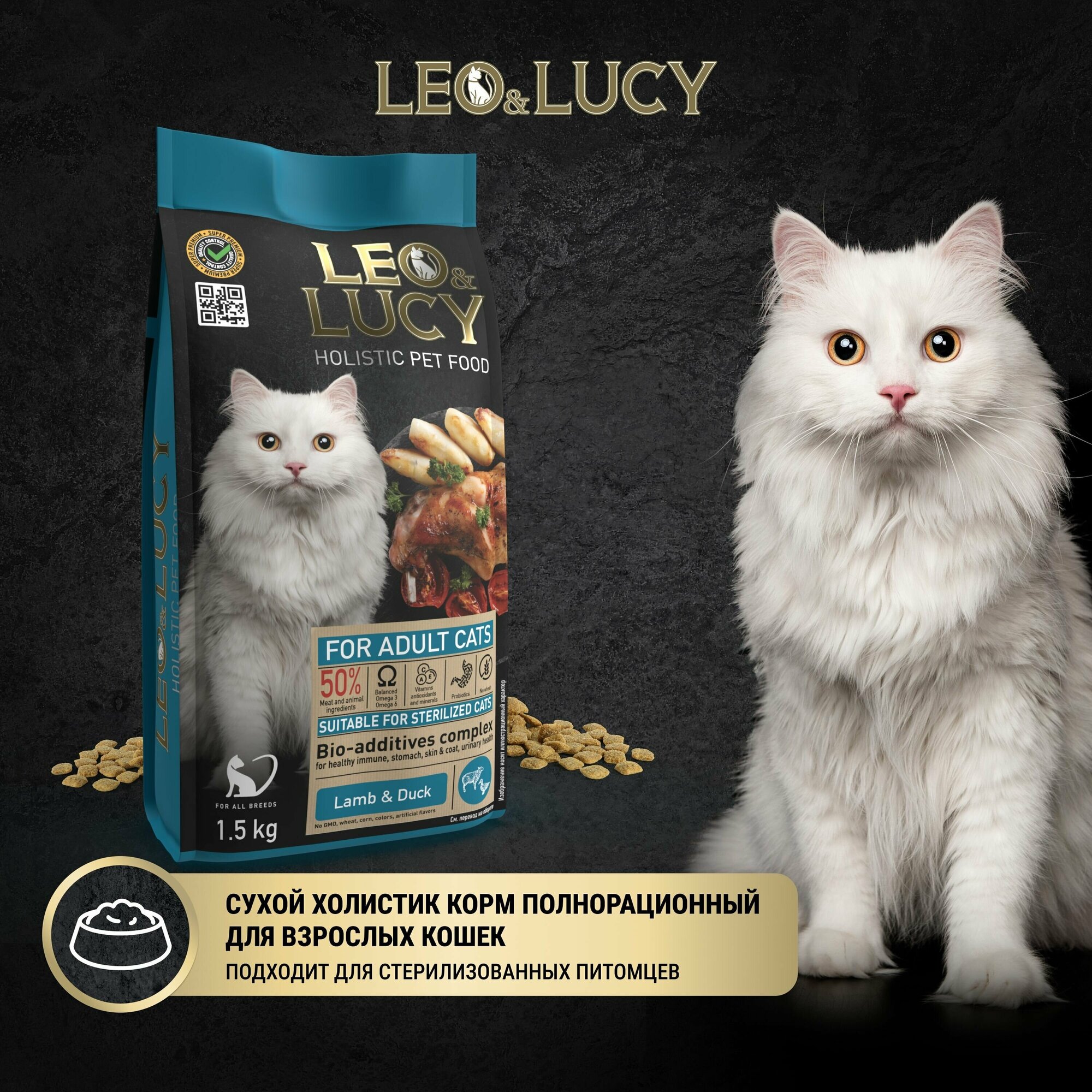 Сухой корм для кошек Leo&Lucy с ягненком уткой и биодобавками подходит для стерилизованных 1.5кг Прорацион