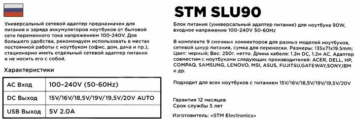Если Вы часто сталкиваетесь с проблемой разрядки Вашего электронного девайса, а именно - ноутбука, то универсальный адаптер сетевого типа от STM модели поможет ноутбуку не подводить Вас своими внезапными отключениями, тем самым, он сохранит Вам нервы и драгоценное время. Прибор имеет тип питания, совместимый со всеми бытовыми сетями, имеющими напряжение с переменным током в сто-двести сорок вольт.