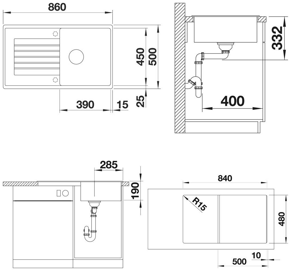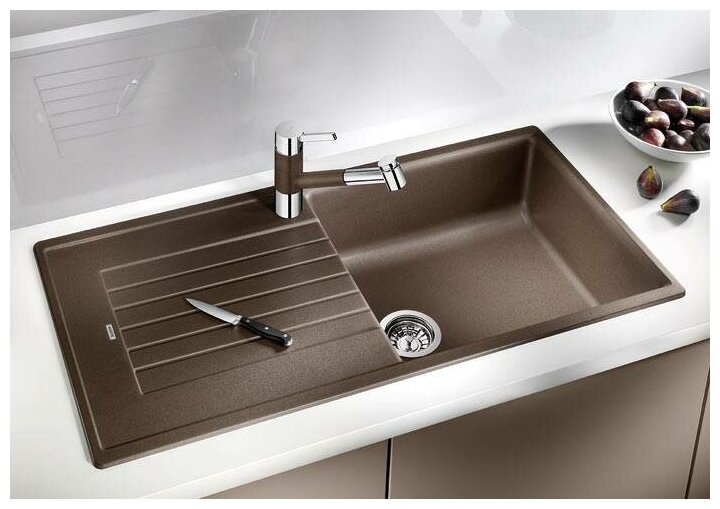 Антрацит. Кухонная мойка Blanco Zia 5S 520511. Оборачиваемая кухонная мойка коллекции Zia выполнена в современном дизайне с преобладанием прямых линий. По периметру она обрамлена тонким кантом и имеет функциональное крыло с канавками для стока воды. Мойка отлично впишется в интерьер любой кухни. Материал Silgranit PuraDur устойчив к механическим воздействиям и высоким температурам. Стойкость к загрязнению и простота в уходе. Непористая структура поверхности. Монтаж: встраиваемый сверху или снизу. Размер чаши (ШxГ): 39 x 45 см. Размер монтажного отверстия (ШxГ): 84 x 48 см. Поверхность мойки обладает антибактериальными свойствами. Слив-перелив. Два размеченных отверстия под смеситель. Объем поставки: чаша мойки, корзинчатый вентиль (3. 5 дюйма), отводная арматура.