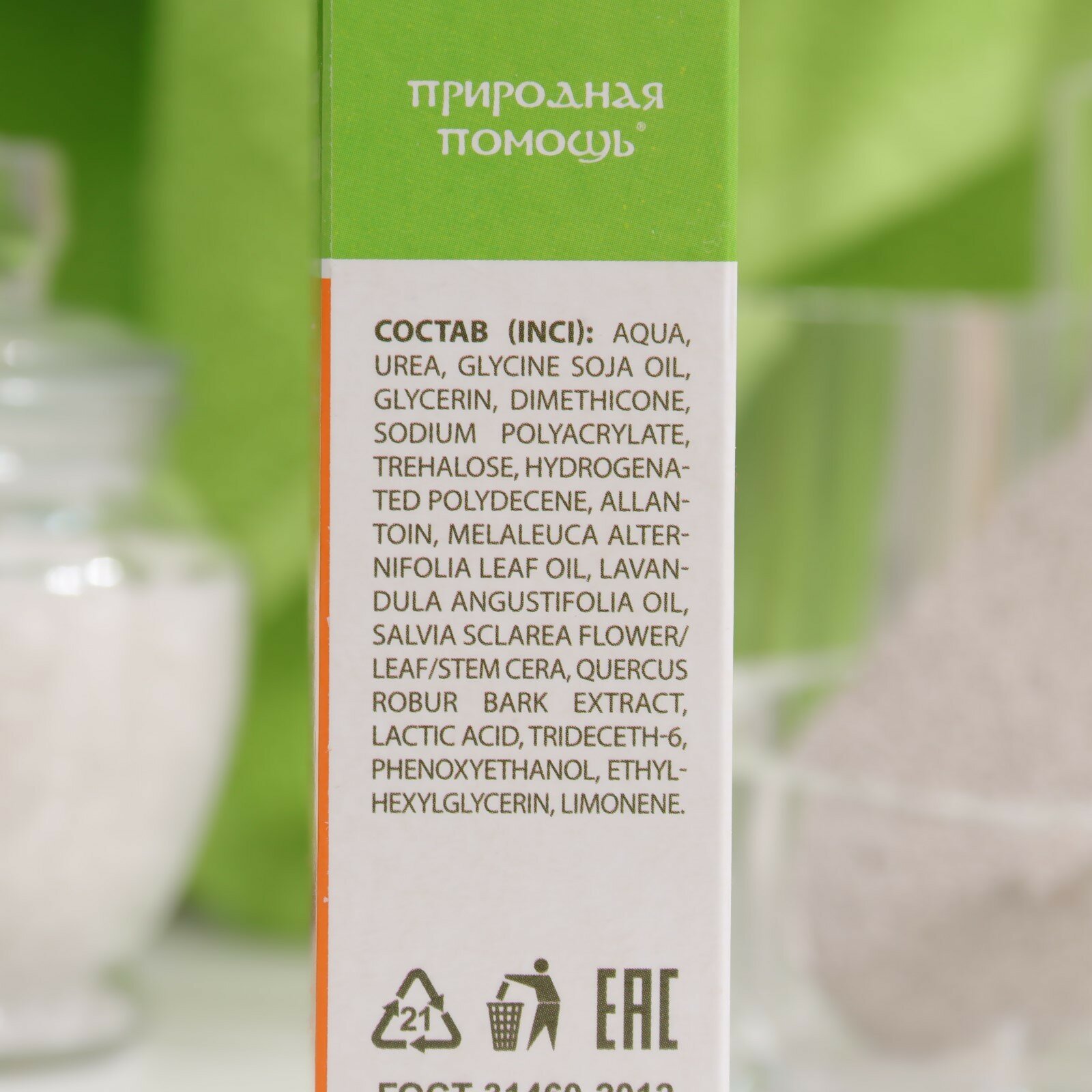 Состав В креме содержится: ? Мочевина. ? Соевое масло. ? Глицерин. ? Полиакрилат натрия. ? Гидрогенизированный полидецен. ? Тридецет-б. ? Циклопентасилоксан. ? Трегалоза. ? Аллантоин. ? Чайного дерева эфирное масло. ? Лаванды эфирное масло. ? Шалфея эфирное масло. ? Дуба коры экстракт. ? Молочная кислота. ? Метилхлороизотиазолинон. ? Метилизотиазолинон. В тубе 50 мл крема. Показания к применению ? Крем для ног при сухих мозолях и натоптышах. Крем для ног с повышенным содержанием мочевины создан специально для ухода за сухой, огрубевшей кожей, склонной к образованию сухих мозолей и натоптышей. Крем также может применяться для восстановления проблемной кожи на ладонях, локтях, коленях. ? Мочевина. Имея маленький молекулярный вес, проникает не только в роговой слой, но и в более глубокие слои эпидермиса. Размягчая огрубевшую кожу, разрыхляя верхний слой, ускоряет отшелушивание отмерших клеток и регенерацию кожного покрова. ? Трегалоза. Обладает сильным увлажняющим действием. Защищает фибропласты кожи от обезвоживания, замещая воду в тканях и помогая сохранить естественную структуру кожи. ? Аллантоин. Смягчает роговой слой, способствуя отделению отмерших клеток, стимулирует регенерацию кожи, обладает смягчающим и увлажняющим действием. ? Эфирные масла чайного дерева, лаванды и шалфея. Являются природными дезодорантами и антисептиками. Особенно полезны при трещинах на коже стоп. ? Экстракт коры дуба с повышенным содержанием дубильных веществ. Обладает вяжущими, дезодорирующими, антисептическими свойствами. Противопоказания ? Индивидуальная непереносимость отдельных компонентов косметического средства. Способ применения и дозы На чистую кожу нанести небольшое количество крема и распределить массажными движениями, уделив особое внимание проблемным зонам. Можно нанести на проблемные зоны тонкий слой крема, оставить для воздействия на 5 -10 минут, затем остатки крема снять салфеткой. Хороший эффект дает применение крема на влажной, распаренной коже (после водных процедур или педикюра). Длительность применения крема не ограничена. Меры предосторожности Условия хранения ? Хранить при температуре от +5°С до +25°С. ? Срок годности: 2 года. ? Хранить в местах недоступных для детей. ? Не использовать после истечения срока годности.