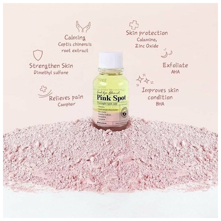 Двухфазное средство Mizon Good Bye Blemish Pink Spot из серии Good Bye Blemish для проблемной кожи предназначено для точечного нанесения на воспалённые зоны. Нанесенное на ночь на проблемные места, средство уменьшает воспаление, успокаивает, снимает покраснение, предотвращает дальнейшее развитие воспалительного процесса и ускоряет заживление. Действие серии Good Bye Blemish основано на комбинации противовоспалительных, антибактериальных и восстанавливающих гидро-липидный баланс кожи компонентах