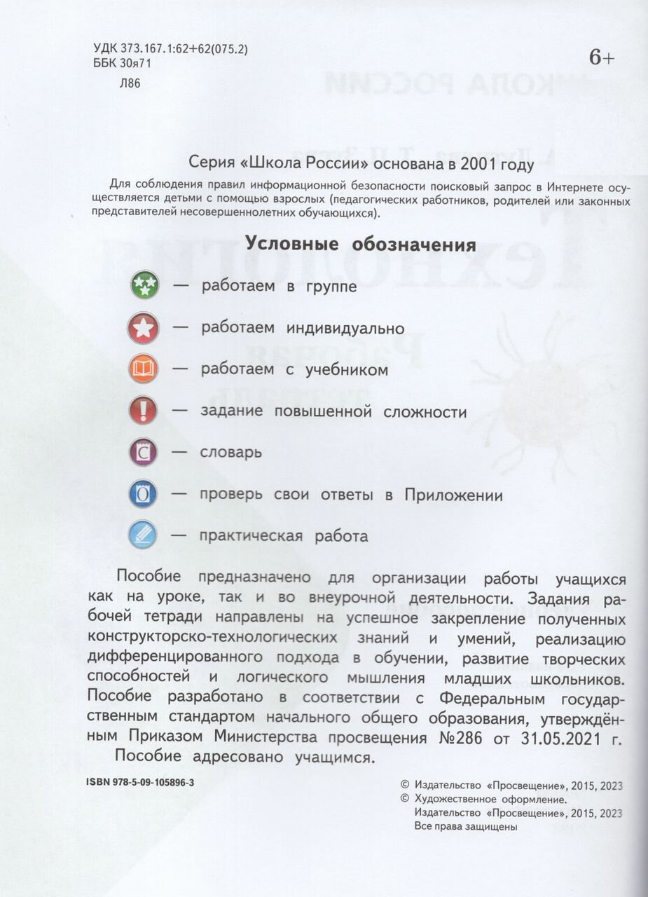 Пособие предназначено для организации работы учащихся как на уроке, так и во внеурочной деятельности. Задания рабочей тетради направлены на успешное закрепление полученных конструкторско-технологических знаний и умений, реализацию дифференцированного подхода в обучении, развитие творческих способностей и логического мышления младших школьников. Пособие разработано в соответствии с Федеральным государственным стандартом начального общего образования, утверждённым Приказом Министерства просвещения №286 от 31.05.2021 г.